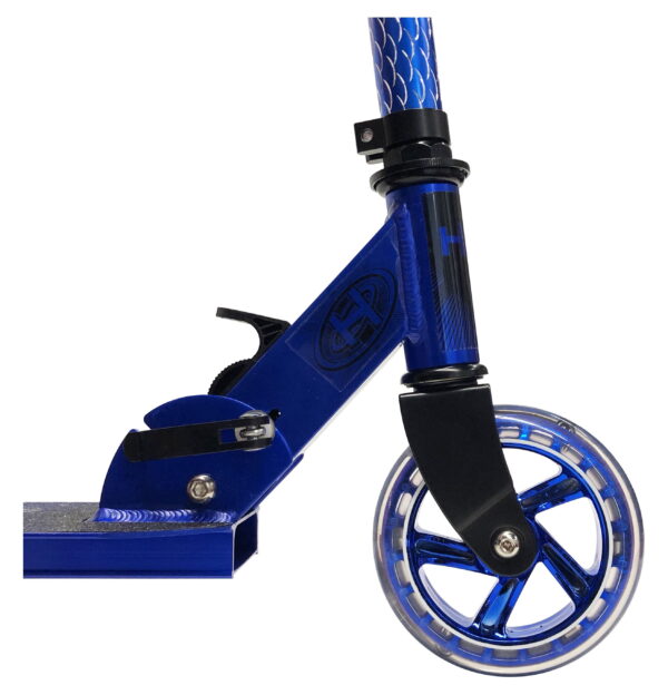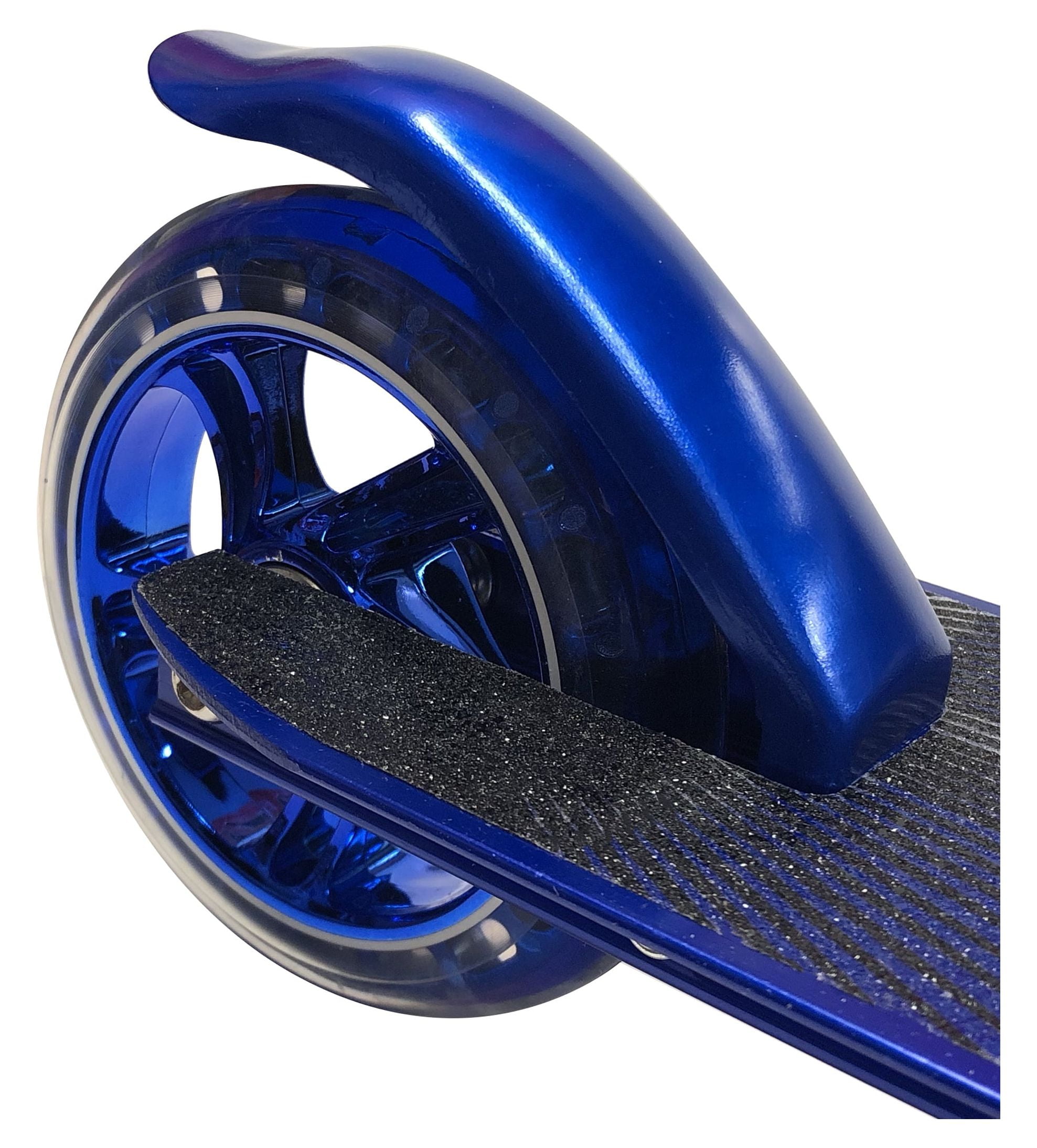 Premium Chrome Finish Shiny chrome deck and frame with blue accents for a bold, modern look. Smooth-Glide 120mm Urethane Wheels Long-lasting, durable wheels designed for a stable, smooth ride. Diamond-Cut Engraved Front Tube Unique, high-end detailing for a premium feel. Height-Adjustable Handlebars Easily adjust to suit riders of different heights for comfort and control. Easy-Grip Rubber Handles Provide a comfortable, non-slip grip for extended rides. Rear Footbrake Quick and reliable stopping power for added safety. Folding Design Folds in seconds for easy storage or transport.