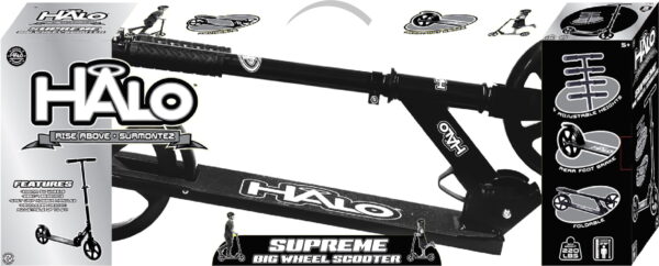 Halo Rise Above Supreme Big Wheel Scooter – Black – Rise Above the rest! Foldable, Height Adjustable, Smooth ride! Premium Aluminum Lightweight Construction Over-Sized Deck = 21″ L x 4.5″ W Handle Bars with Rubber Grip = 15.5″ W Height Adjustable to 4 heights 28″-36″ Ideal for riders 4ft and up! Supports riders up to 220 lbs XL wheels (urethane) with ABEC-7 bearings for a smooth ride Suitable for Ages 5 and Up No Assembly Required Anti-Slip Grip Tape on the Deck! Perfect for Birthday or Holiday Gifts! Looking for a gift? An ideal value, look and feel for birthdays, Easter or Christmas! Fun for All Ages – Children, Teens and Adults Unisex – Designed for all riders!
