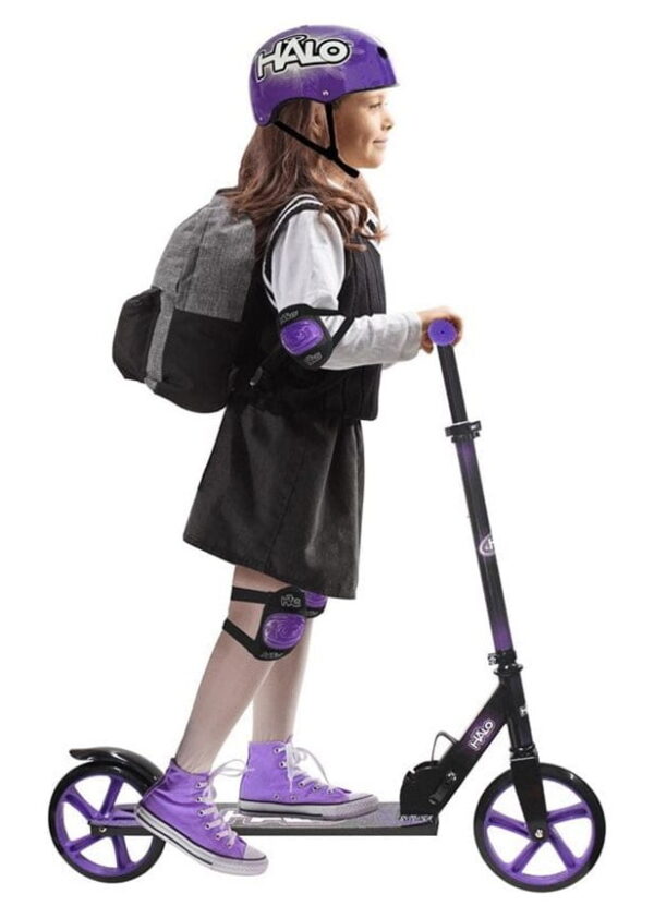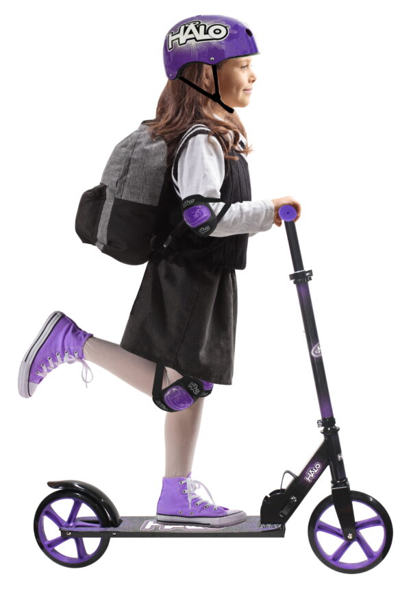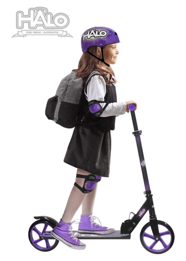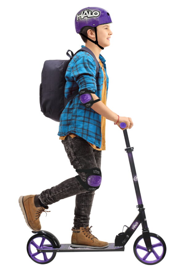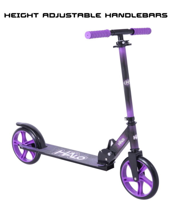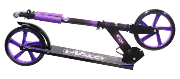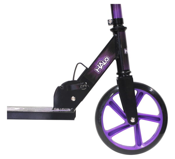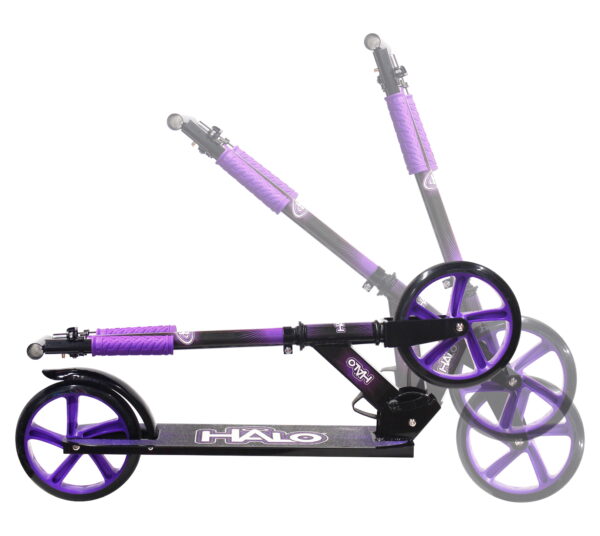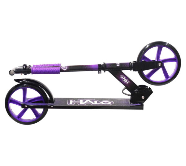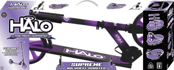 HALO Rise Above Supreme Big Wheel Scooter – Purple/Black – Rise Above the rest! Foldable, Height Adjustable, Smooth ride! Premium Lightweight Aluminum Construction XL 200mm Long Lasting Wheels (urethane) for a smooth ride Over-Sized Deck = 21″ L x 4.5″ W Height Adjustable to 4 heights! Find your perfect height, set it and lock it in! 28″ – 37″ Handle Bars with Rubber Grip = 15.5″ W Supports riders up to 220 lbs Suitable for Ages 5 and Up No Assembly Required Unisex – Designed for all Riders – Adults, Teens and Tweens Also Available in All Black, Red, Blue, Pink and Green