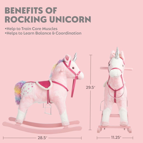 TODDLER ROCKING HORSE – This toddler toy features a soft saddle and plush body for comfort, while the design inspires your little ones to create their own make-believe fairy-tale story. REALISTIC SOUNDS – The horse ride on toy makes galloping and neighing sounds just like a real horse by simply pressing a battery-operated (two AA batteries not included) button behind the right ear. SMART DESIGN – The toddler rocking toy is made with easy-grip handles, stirrups, curved rails that create smooth rocking, and a steel frame that provides stability and durability for years of play. EASY TO USE – Powered by your childs energy, the horse toys are easy for them to rock, while helping toddlers improve their muscle strength, balancing skills, and coordination. MATERIALS – Soft Plush, Polyfoam, Polyester, Steel, and Natural Wood; Recommended Use: For Children Ages 3 and up; Use on Flat Surfaces; Requires 2 AA Batteries (Not Included). DIMENSIONS – (L) 28.5 x (W) 11.25 x (H) 29.5; Seat: (H) 19. COLOR – Pink.
