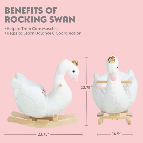 TODDLER ROCKING HORSE – This toddler rocker swan is designed with a 3-sided seat made of soft materials, an adjustable seat belt for secure fun, and a plush body for comfy play in any playroom, nursery, or daycare. SMART DESIGN – The rocking toy is made with easy-grip handles, curved rails that create smooth rocking, and a steel frame and wood base that provides stability and durability for years of play. EASY TO USE – Powered by your childs energy, our rocking horses are easy for them to rock, while helping toddlers improve their muscle strength and balancing skills. GREAT GIFT – This kids rocker has an adorable design that kids are sure to love, making it a great gift for birthdays, Christmas, and other occasions. MATERIALS – Soft Plush, Polyester, Steel, and Natural Wood; For Children Ages 18 Months and up; Use on Flat Surfaces. DIMENSIONS – (L) 23.75 x (W) 14.5 x (H) 22.75; Seat: (L) 6 x (W) 9.5; Seat Height from Ground: 9. COLOR – White.