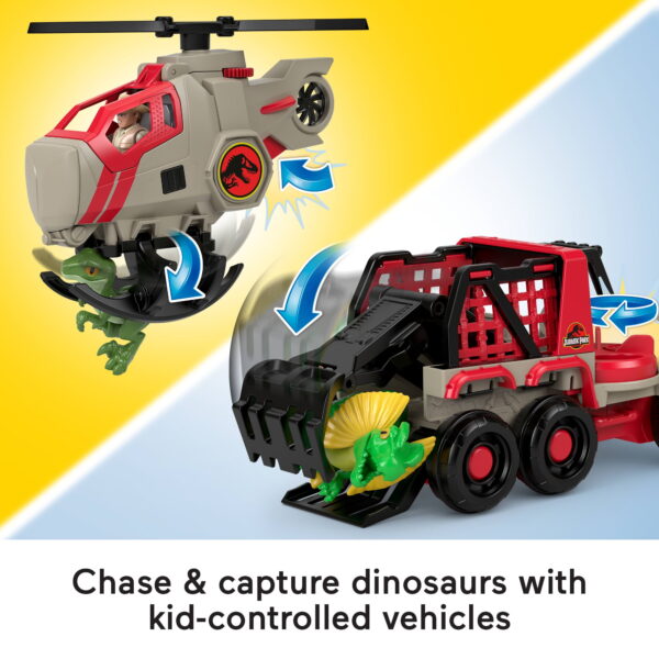 Preschool kids can create action-packed stories inspired by the original Jurassic Park film with this 19-piece dinosaur playset from Fisher-Price! The Imaginext Jurassic Park Dino Recon set includes 7 poseable figures styled like characters from the movie, plus 8 small dinosaurs and a kid-controlled Mega Mouth T. rex that can lunge, chomp, and swallow figures whole! Kids will love chasing and capturing dinosaurs with the roll-along 6×6 vehicle and toy helicopter again and again. Colors and decorations may vary.