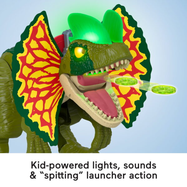 Relive iconic Jurassic World movie moments with this extra-large, 16+ inch tall Dilophosaurus dinosaur toy with cool lights, sounds and actions Kid-controlled action: Press the tail or neck triggers to open the dinosaurs mouth, light up her eyes, mouth & frills, and activate fun roaring sounds Tail trigger also activates projectile launching spitting action (includes 4 projectile discs) Turn the tail to see her frills extend with cool lights & sounds Encourages imaginative play and storytelling for preschool kids ages 3 to 8 years old Smilestones: Bringing a smile to milestones! This toy helps foster Imaginative Play by letting kids narrate their own scenarios, create pretend problems, and work through the solutions