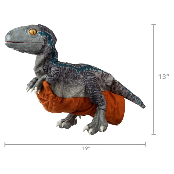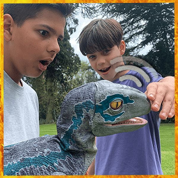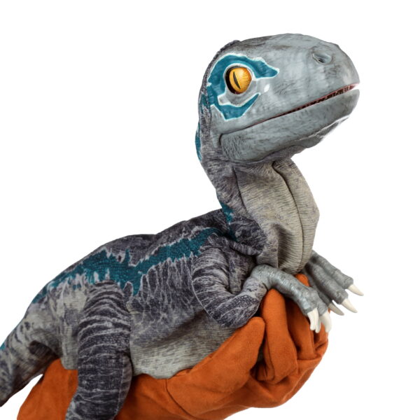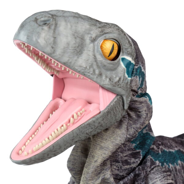 A movie-scale ‘life size’ baby dinosaur, it has a built-in RealFX pistol grip controller mechanism concealed by an authentic Rangers faux leather handling glove! The controller allows you to bring it to life in multiple ways. No one will know how she has come to life, but they will believe she has! Baby Blu is a true icon that helped the Jurassic Park movie set new records for a movie theatrical release 30 years ago! This full-scale baby dino comes to life in your hand like no remote-control toy ever could! RealFX Baby Blu bites, lunges, head-tilts, snarls, blinks eyes and ultimately protects its owner. It includes more than 40 sounds and movements that are touch activated. Plus, wait until you hear the hidden bonus sounds!