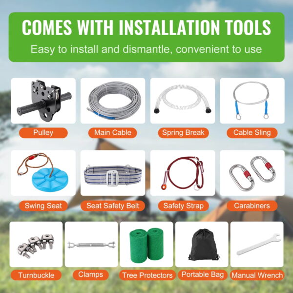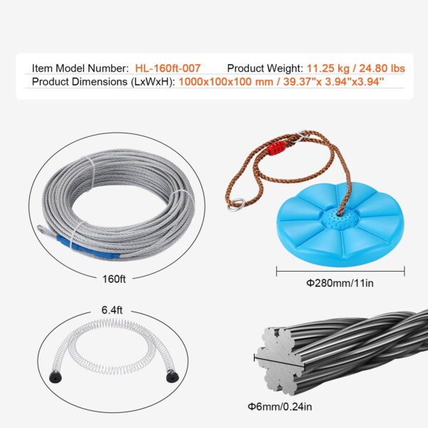 Product Description Zip Line Kits Specially designed for children’s exercise and play, this outdoor recreational equipment is perfect for family gatherings in the backyard. Its durable materials and stainless steel spring brake system provide a safe foundation, allowing you to accompany your child securely and enjoy the fun. For Children’s Exercise and Play This children’s zip line kit is made from high-quality stainless steel and are finely crafted. Suitable for both adults and children, they offer endless outdoor fun. Multiple Protections Double protection with seat safety belts and rope safety harnesses, significantly reducing the possibility of injuries. Anti-slip handles provide maximum safety for children’s outdoor activities. Upgraded ball bearings and thickened protective steel eliminate risks. Spring Brake System Our spring brake system is made of stainless steel, offering higher toughness and durability. The spring brake effectively maintains a safe distance between children and trees, ensuring safety. Easy to Install This children’s quick setup zipline set can turn your yard into a playground. It is easy to install, allowing for joint activities with children, stimulating their physical abilities, and creating perfect parent-child moments. Rich Accessories The zipline kits comes with a wealth of accessories, including all the outdoor devices needed for safer outdoor activities. Unleash your youthful energy to the fullest. The Perfect Gift An ideal holiday gift idea, you can enjoy endless outdoor fun with your children. This backyard zip line kit also great for family gatherings in the backyard. Specifications Item Model Number: HL-160ft-007 Product Weight: 11.25 kg / 24.8 lbs Product Dimensions (LxWxH): 1000x100x100 mm / 39.37×3.94×3.94 inches Package Content 1 x Zip Line Kit 1 x Set of Accessories