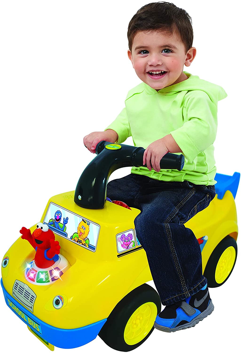 Adorable school bus themed ride on toy will have your toddler scooting and exploring with their pal Elmo from Sesame Street Plays fun music, realistic engine sounds, and funny phrases from Elmo Dashboard includes colorful gears designed to stimulate fine motor skills Encourages essential developmental skills, including gross motor and independent play Sturdy handle helps your child stay balanced and practice steering Bright flashing lights engage your childs attention Fun decals feature Big Bird, Grover, Ernie, Rosita, Cookie Monster, and Abby Cadabby Includes: 2 AA batteries Color: Yellow