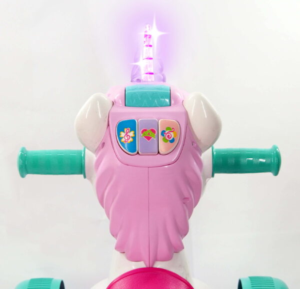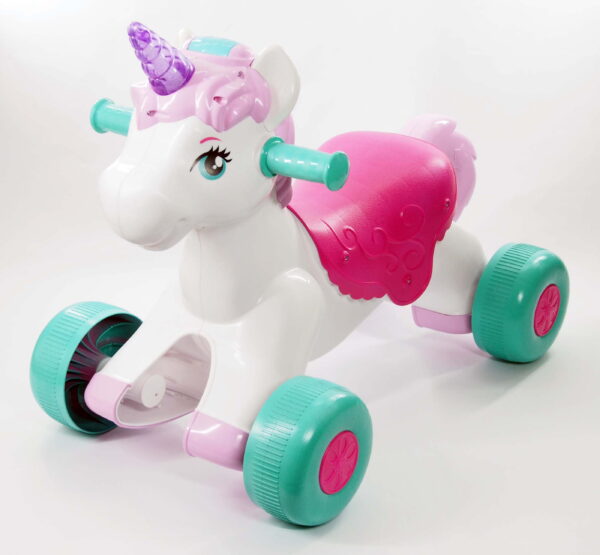 Kiddieland Light N Sounds Magical Unicorn Makes Noise Unisex Push & Pedal Ride-Ons 6.17 lb Get ready for a magical adventure by Kiddieland Hear realistic trotting and whinny sounds with flashing colorful lights Encourages creative play while helping develop hand & eye coordination Safe and durable construction for hours of riding fun Cute unicorn plays fun sounds and lively music Unisex design suitable for all children