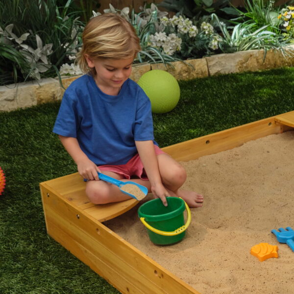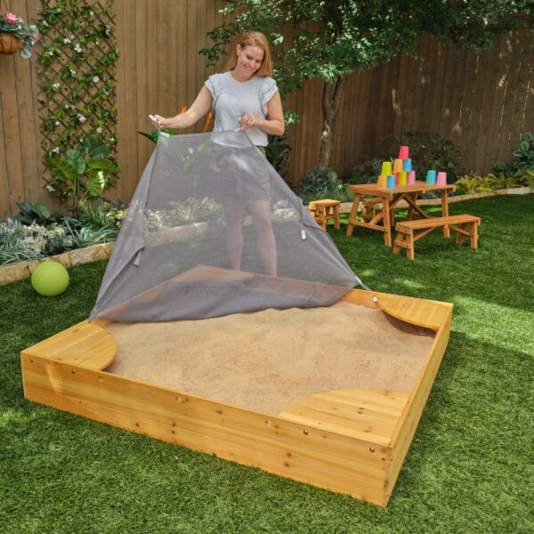 KidKraft Wooden Backyard Sandbox with Built-in Corner Seating and Mesh Cover, Honey