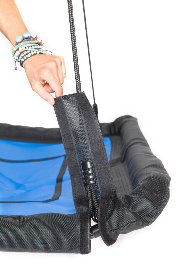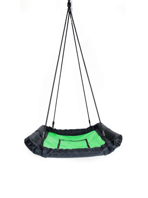 Rectangular platform swing stands out from the competition through the upturned edges. The long sides of the swing are angled upward to form a comfortable place to lean while lounging or reading Holds up to 300lb – pile on some kids or take a ride with the whole family! Made from UV-tested material so that your swing stays bright and colorful through the elements. Easy to follow instructions to connect the partially pre-assembled frame Swing hangers or hanging straps are not included Hang ropes side-by-side on swing hangers, or hang both ropes on one center swing hanger for more of a spin (does not rotate 360 degrees) Exceeds all ASTM standards, ensuring the safety of your family for many rides to come Available in both blue and green