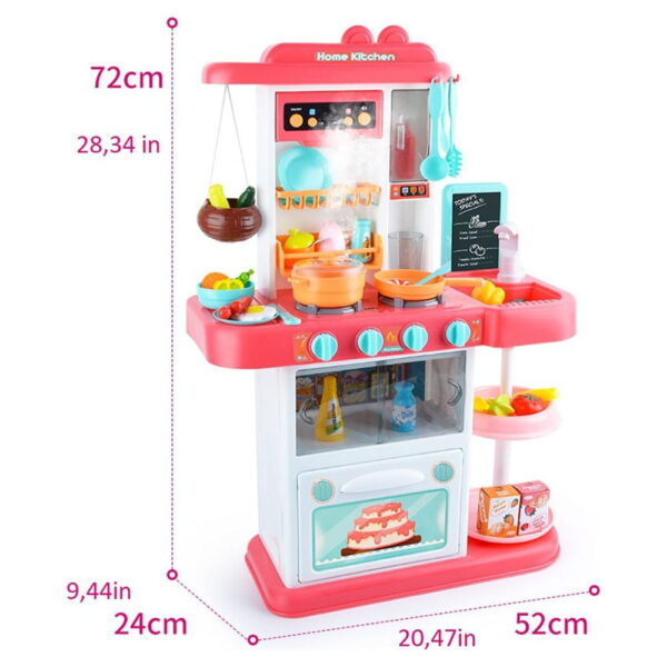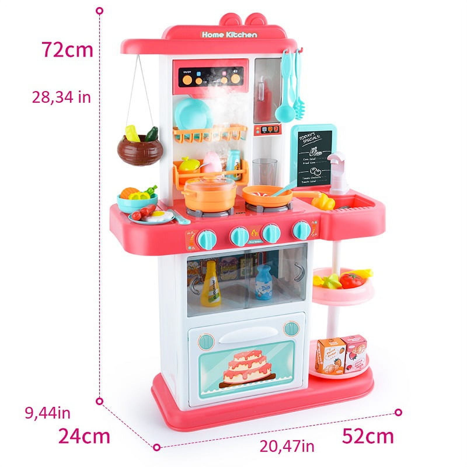 Dimensions: 72 cm H x 52 cm W x 24 cm D (28.34″ x 20.47″ x 9.44″) Realistic kitchen playset with light, sound, and spray steam effects for immersive play Working water faucet with circulating pump simulates real sink usage. Electronic Stovetop: Pretend stovetop burner features realistic electronic lights and Sounds. Place the pot and pan on the stove,turn on the button, Spray will comes out while your kids cooking.Working lights,sizzling sounds,simulation of spray and play sink add to the pretend play fun! Fun and Educational Role Play Kitchen Toy: Simulated Kitchen Toy with many realistic cooking utensils,your little one can role-play with their friends or parents,learn to identify colors of vegetables and fruits while playing, improving their hands-on, imaginative, language and social skills.