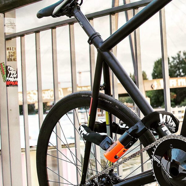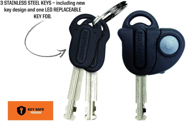 10mm six-sided chain links made from 3t manganese steel High security disc-style cylinder is pick and drill resistant Sliding dustcover protects and extends cylinder life 3 stainless steel keys Durable weather-resistant nylon sleeve prevents scratches Key Safe Program E-Bike Approved