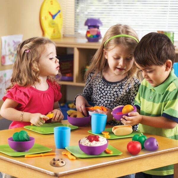Perfectly sized kitchen play for your whole class New Sprouts Classroom play food set features a modern design, soft rounded parts and easy-grip handles Large set includes components of serve it (LER 3294), cook it (LER 9257) and bake it (LER 9258) Coordinates with the New Sprouts Classroom Play Food Set (LER 9723) Includes 44 pieces stored in a handy tote Warning: choking hazard, small parts, not for children under 3 years