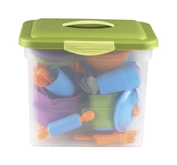 Have a fun playtime with Learning Resources New Sprouts Classroom Kitchen Set. Children can bake, cook and serve their imaginary food. The 44 pieces are stored in a clear rectangular plastic box with a green lid and handle. Play items have handles that are easy to hold and parts that are soft and round. The Learning Resources kitchen set is suitable for toddlers 2 years of age and older. This item will make an excellent gift for a birthday or holiday.
