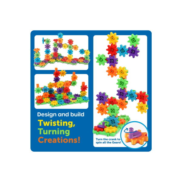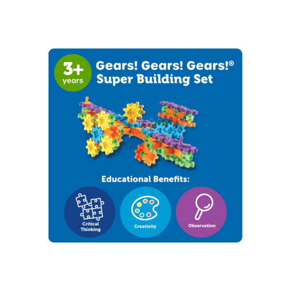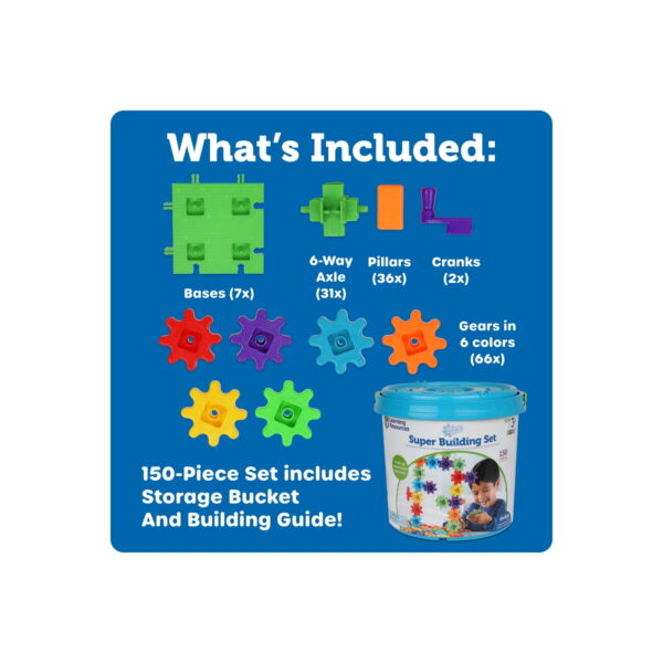 Learning Resources Gears Gears Gears Super Building Toy Set – Building Toys, STEM Unleash your child’s engineering potential with the Gears! Gears! Gears! 150-Piece Super Building Set. This comprehensive collection includes 66 colorful gears, 36 pillars, 31 axles, connectors, bases, and handles that snap together effortlessly. As children construct unique moving structures, they develop fine motor skills and spatial reasoning while learning mechanical principles. Simply insert a handle into any gear to bring creations to life with mesmerizing spinning action. Perfect for ages 3+
