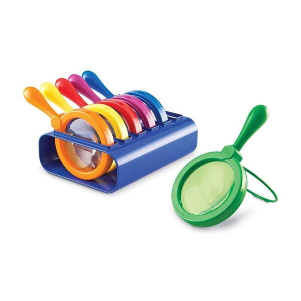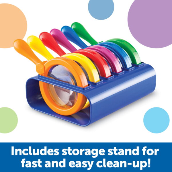 PERFECT FOR LITTLE HANDS – Designed specifically for small children with chunky, easy-grip handles measuring 8″ long and oversized 4.5″ diameter lenses that are ideal for preschoolers DURABLE CONSTRUCTION – Made with thick, shatterproof plastic lenses and sturdy frames that withstand frequent drops, rough handling, and daily classroom use HANDS-FREE EXPLORATION – Each magnifier features a convenient flip-out stand that allows for stationary, hands-free viewing of insects, plants, rocks, and other fascinating discoveries. POWERFUL MAGNIFICATION – 4.5x magnification provides the perfect balance between clarity and detail, allowing young scientists to observe tiny details while maintaining an appropriate field of view. COMPLETE CLASSROOM SET – Includes 6 rainbow-colored magnifiers with a convenient storage stand, making organization easy and encouraging sharing during group activities in homes, and classrooms