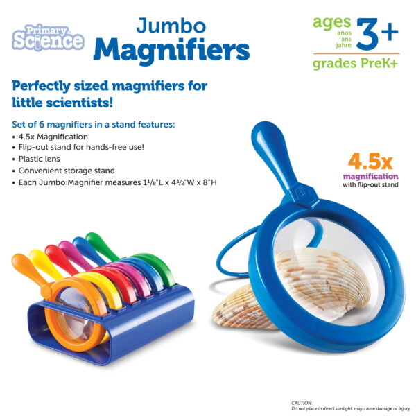Learning Resources Jumbo Magnifiers With Stand – Toddler STEM Toys, Classroom Must Haves Inspire young scientists with our Jumbo Magnifiers with Stand, perfect for ages 3+. These extra-large magnifiers feature comfortable handles sized perfectly for small hands, ensuring a secure grip during exploration. The built-in flip-out stand on each magnifier enables hands-free viewing, allowing children to observe while drawing or taking notes. With powerful 4.5X magnification, little ones can examine critters, rocks, fabrics, and more in fascinating detail. Durable plastic lenses withstand enthusiastic use, while the included organizational stand