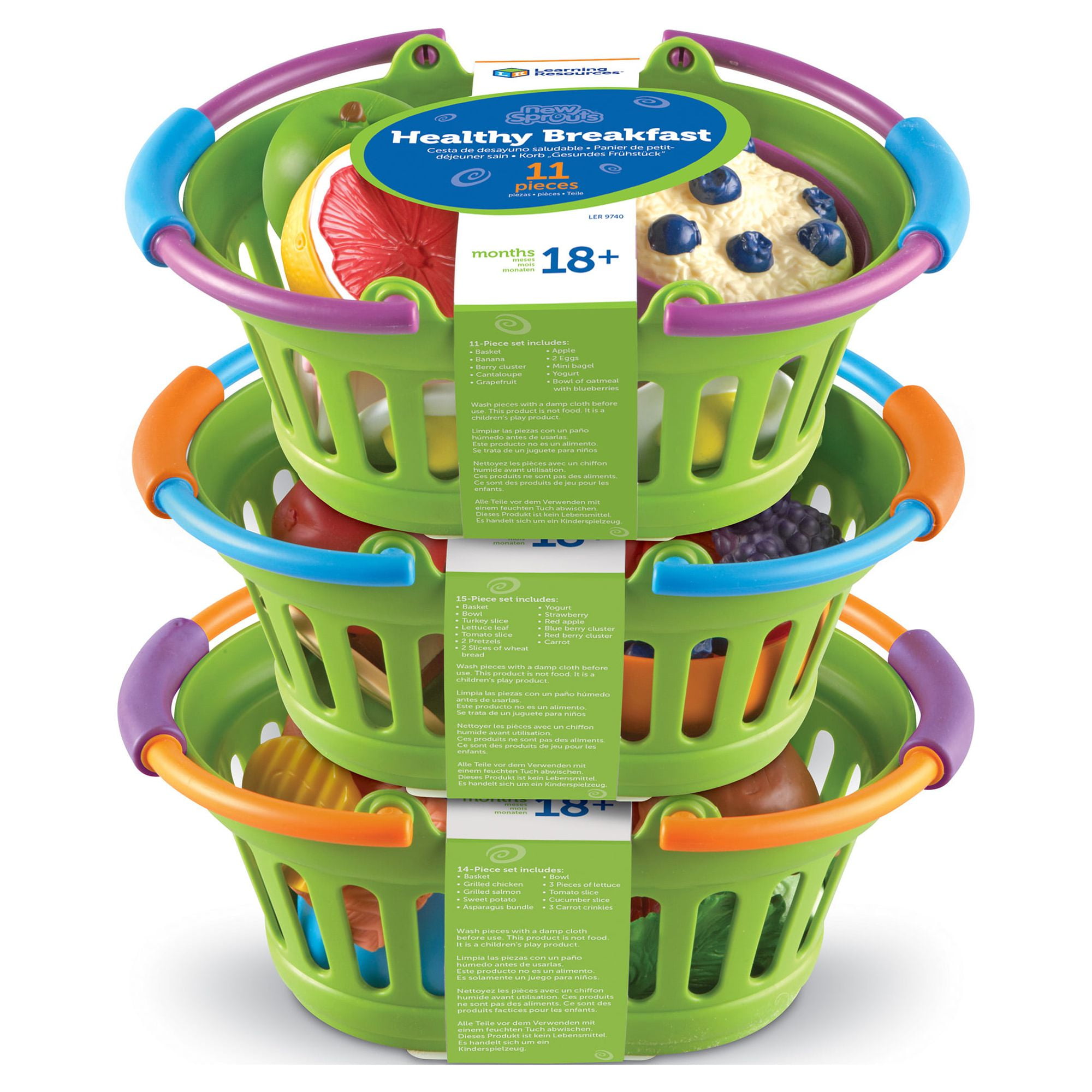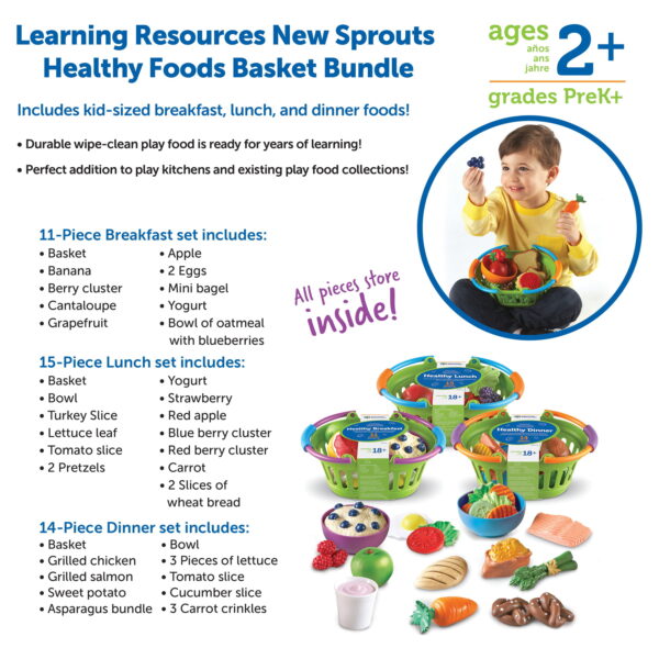 Help children make good nutritional choices at every meal Healthy breakfast, healthy lunch and healthy dinner baskets in 1 convenient bundle For toddlers Ages 18 months + New Sprouts play food set comes with 3 baskets with handles for easy carrying Each basket contains different individual toy food items such as fruits and vegetables New Sprouts basket bundle is suitable for homes, preschools and daycare programs 18 pieces in total GIVE THE GIFT OF LEARNING: Whether youre shopping for holidays, birthdays, or just because, toys from Learning Resources help you discover new learning fun every time you give a gift!