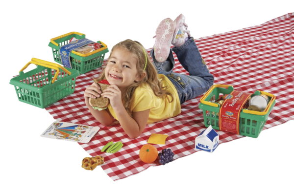 Healthy Foods Play Set encourages children to play their way to a healthy lifestyle! Three baskets of healthy meal choices (breakfast, lunch, dinner) are packed with nutritious foods. Sets include shopping basket, activity card and teaching guide for each meal. Great for developing oral language through role play. All pieces are actual size and washable. Baskets measure 10-3/4 L x 5-1/4 W x 8-1/2 H inches. Ages 3 and up. Includes 52 pieces. Includes:Breakfast Basket: English muffin half, egg, banana, 7 strawberries in a bowl, 2 pancakes, butter, yogurt cup and orange juiceLunch Basket: 2 Slices of wheat bread, 2 slices of turkey, lettuce, tomato, 1 slice of American cheese, 4 celery sticks, 2 pretzels, grapes, an orange, and milkDinner Basket: Grilled chicken breast, spaghetti with tomato sauce, peas, beans, potato, 4 apple slices, 5 carrot sticks, French bread and milk