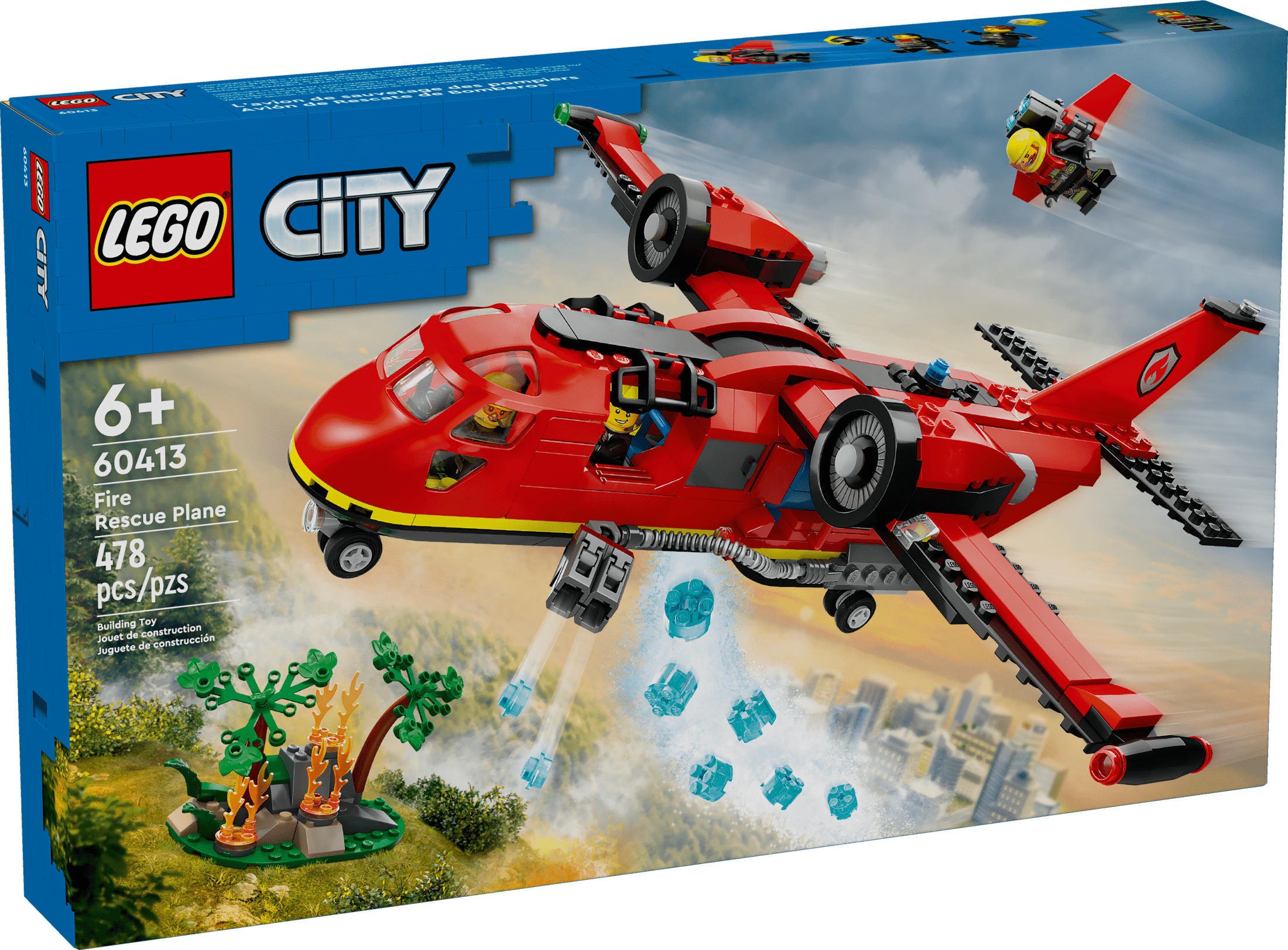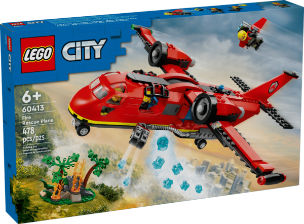 Heres an impressive firefighter toy for kids ages 6 and up the LEGO City Fire Rescue Plane (60413) complete with realistic features, including a waterdrop function and 2 water element launchers. The twin-engine airplane toy also has an opening rear cargo door and a dual cockpit, and includes pilot, extinguisher operator and jetpack firefighter minifigures, plus a wildfire scene for action-packed play. This emergency rescue plane toy for kids includes an easy to follow printed building guide and step-by-step 3D instructions in the LEGO Builder app. Here kids can zoom in and rotate to visualize models from all angles as they build. LEGO City Fire playsets deliver feature rich land, air and water toys for imaginative play without limits. Kids can add this toy fire plane to other sets (sold separately) from the LEGO City collection for even bigger adventures! Contains 478 pieces.