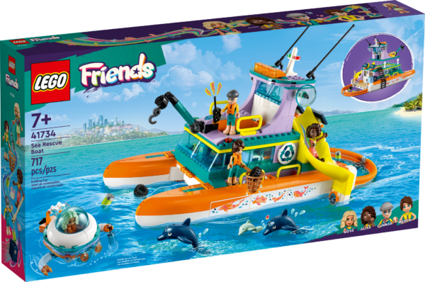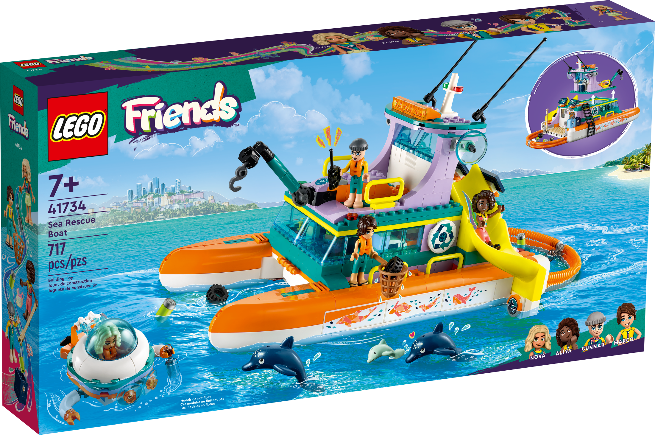 Sea rescue play for kids ages 7+ Kids who love the natural world of the ocean can imagine cleaning up the shores of Heartlake City as they build and play with this fun LEGO Friends Sea Rescue Boat set (41734) 4 characters and accessories Includes LEGO Friends mini-dolls characters Aliya and Nova, plus the boats captain Gunnar and friend Marco Accessories for role play Comes with submarine, a net and stick to collect trash, life jackets for all characters, different types of trash, water samples, sunscreen, a coffee machine, syringe and a microscope Act out the story Kids can explore different activities such as gathering trash from the ocean, sorting the trash into different bins for recycling, analyzing water quality and more A gift for kids who love sea life This LEGO Friends set makes a gift idea for boys and girls ages 7 and up who would love to build a Sea Rescue Boat and create their own ocean adventures Sized for young builders The LEGO Friends Sea Rescue Boat toy measures over 8 in.(20 cm) high, 13 in. (33 cm) long and 7 in. (18 cm) wide A helping hand Discover intuitive instructions in the LEGO Builder app, where builders can zoom in and rotate models in 3D, track their progress and save sets as they develop new skills