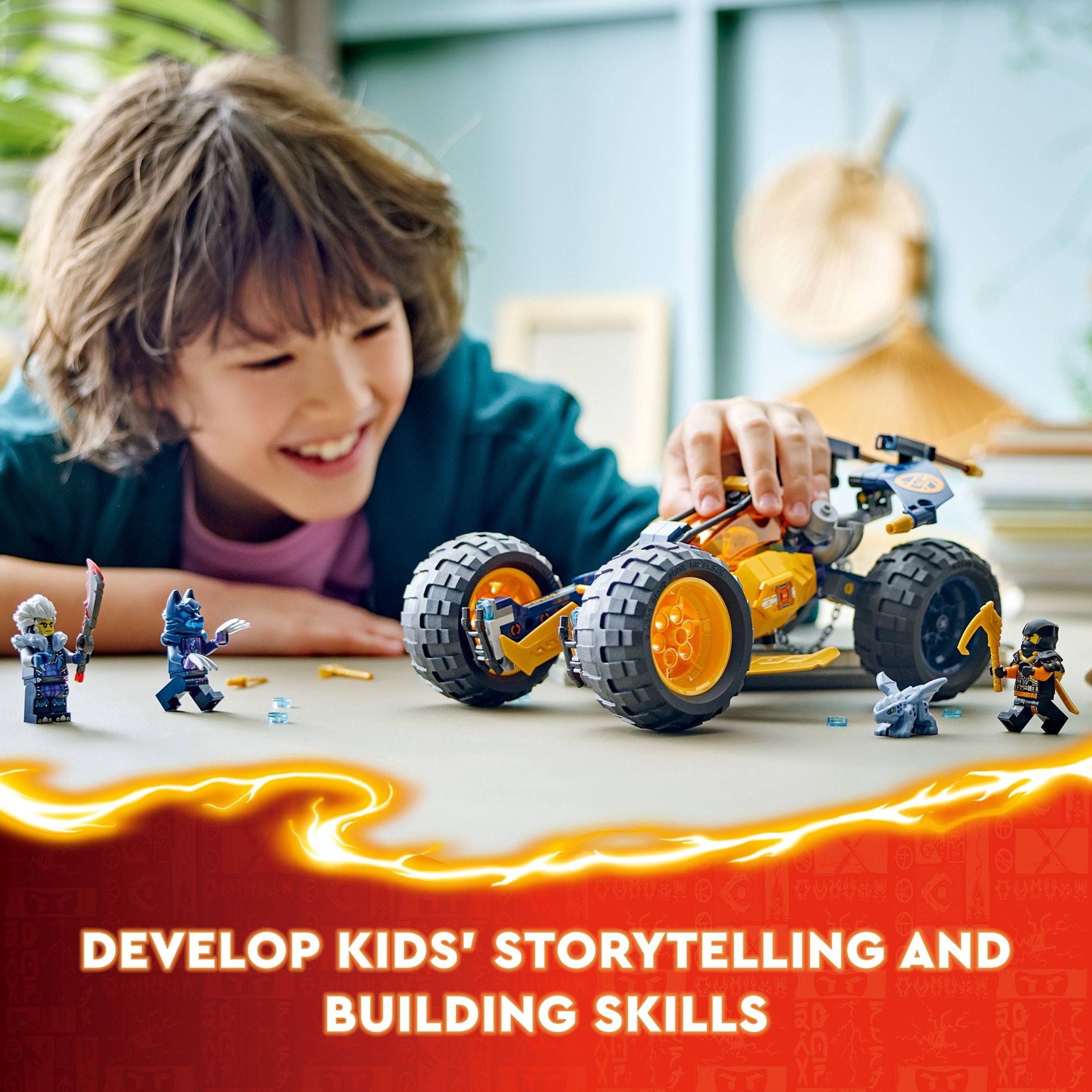 Off-Road Buggy Car ninja toy for kids Boys and girls ages 7 and up can play out battles from season 2 of the NINJAGO Dragons Rising TV show with Arins ninja off-road vehicle toy Vehicle building kit packed with features The ninja car toy has moving wheels, suspension, an opening cockpit with space for 2 minifigures, 2 stud shooters with 6 studs to fire and a large hook 4 NINJAGO characters This adventure car set comes with ninja minifigures Arin and Climber Cole to battle Cinder and a Wolf Mask Claw Warrior, plus a Baby Riyu dragon toy Weapon accessories Climber Cole and Arin are each armed with a climbing hook and a katana sword accessory and Cinder has a sword accessory Ninja gift This adventure toy provides a fun build and play experience and is a great birthday gift for 7 year old boys and girls who love playing out ninja action stories Bigger ninja adventures Look out for more NINJAGO toys (sets sold separately) featuring dragons, mechs and vehicles A universe of ninja toys LEGO NINJAGO sets include dragons, vehicles and temples and let kids escape into a fantasy world of adventures with their ninja heroes