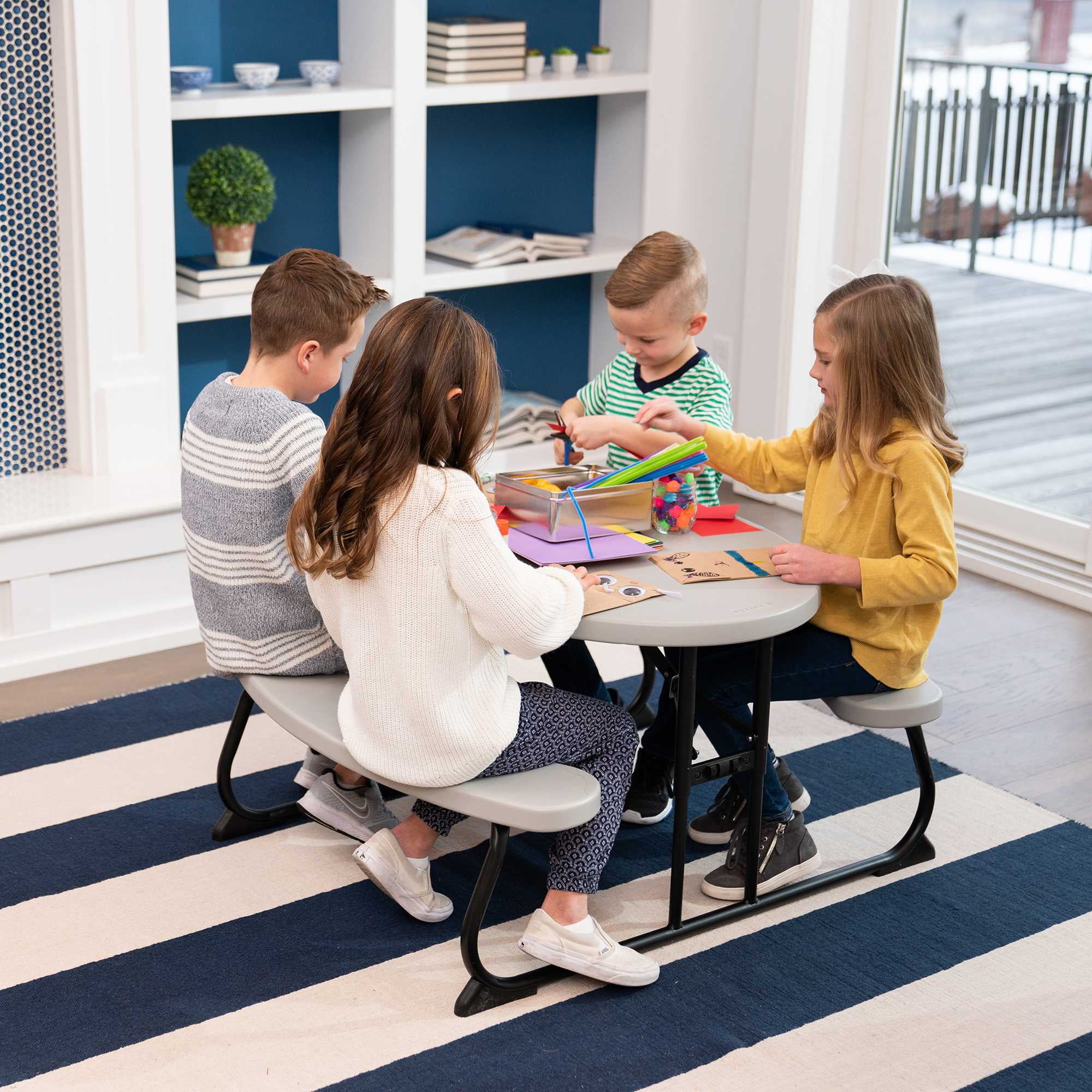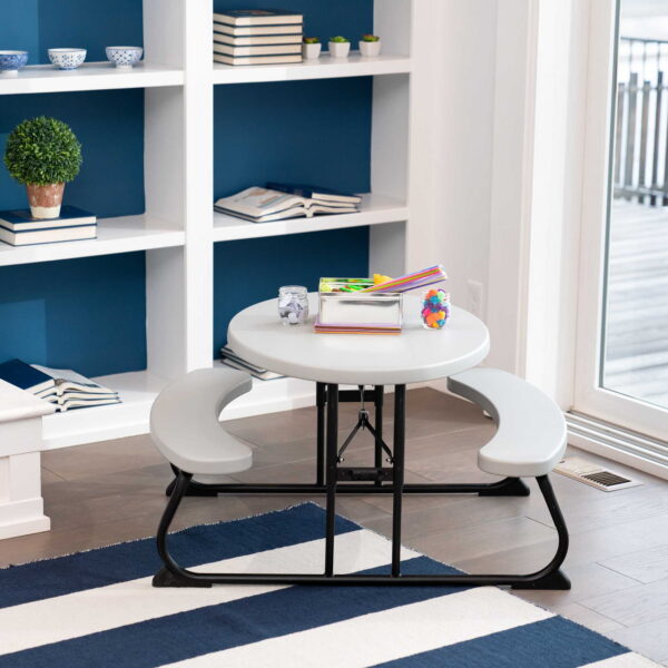 Give your kids a place to call their own with a kids picnic table from Lifetime Products. Seating up to four kids comfortably, the kids picnic tables fold flat for easy storage and transportation. Designed for indoor or outdoor use for all occasions. With an innovative one-hand adjustment mechanism and constructed of high-density polyethylene (HDPE) and powder-coated steel, this Children’s picnic table is also stain resistant, easy to clean, and UV protected.