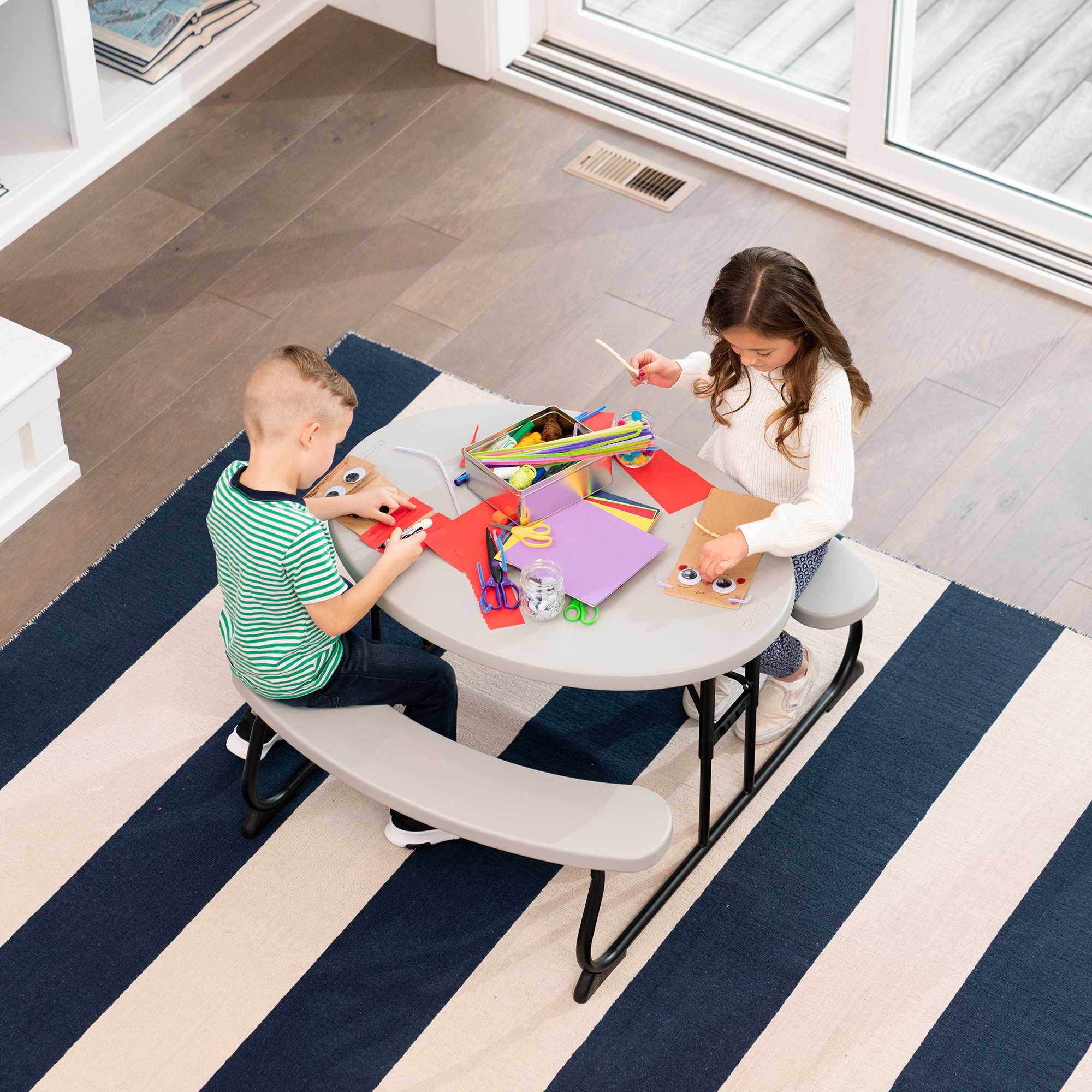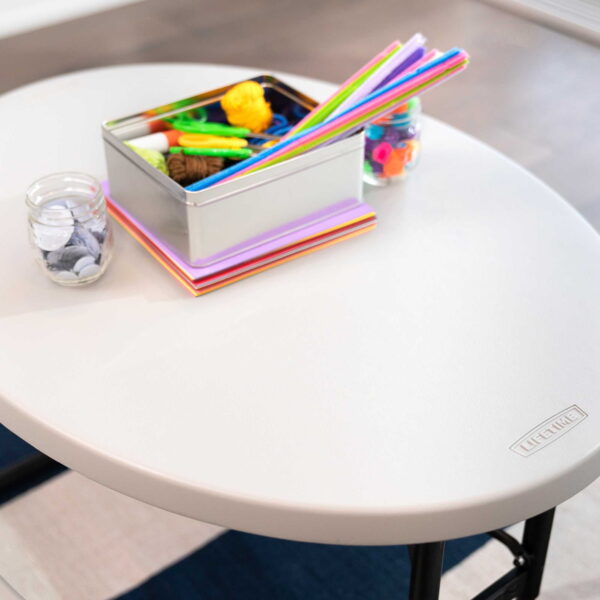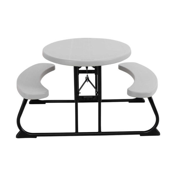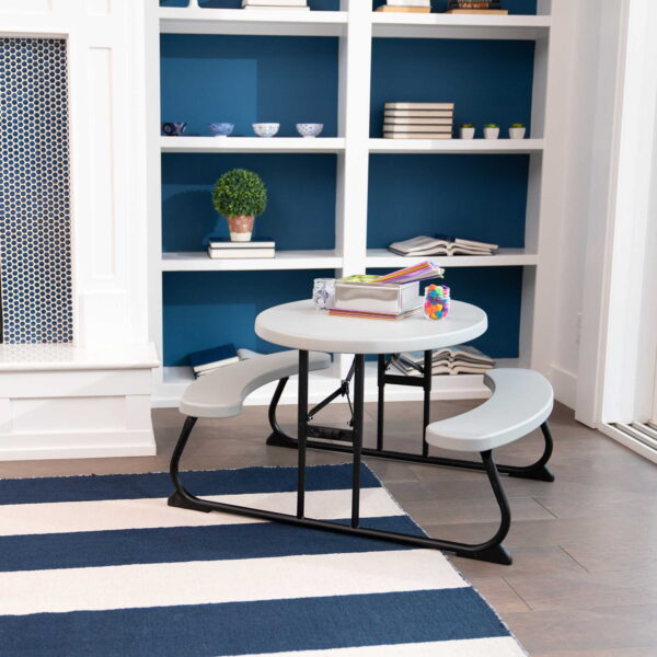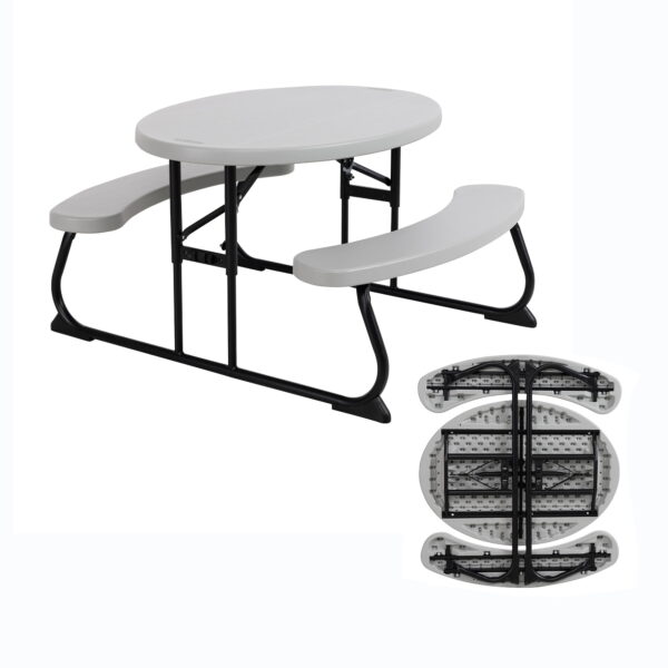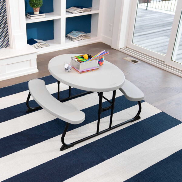 Lifetime Children’s Polyethylene Picnic Table Adult setup required Durable steel frame with all-weather finish Folds flat for storage Non-slip foot caps Recommended for ages 3-8 Suitable for indoor and outdoor use Superior strength and durability UV-Protected Polyethylene Tabletop Will not crack, chip, rust, or peel