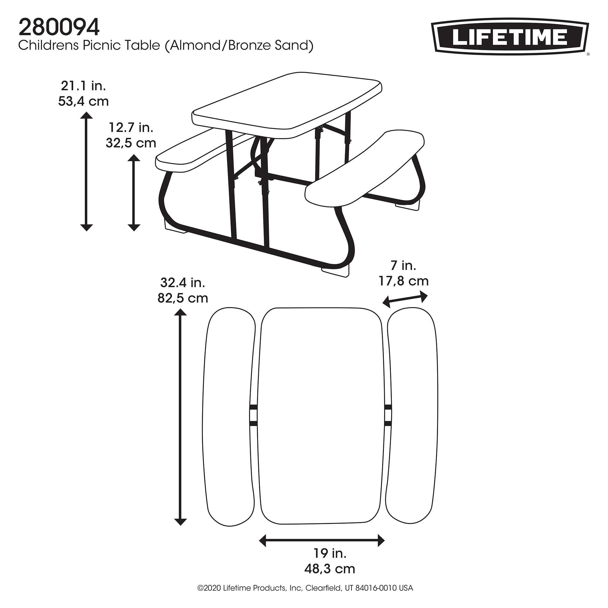 Lifetime Children’s Picnic Table , Almond (280094) Steel Frame with All-Weather Finish Simple Push Pin Mechanism for Setup or Takedown Rigid Table Top Folds Flat for Storage Will Not Crack, Chip, Rust, or Peel Stain Resistant and Easy to Clean Bright, Fun Colors that Foster Imagination Specifications: Color: Almond Material: Powder-coated steel Warranty: Manufacturer’s limited 2-year warranty Ages 3-8 years Bench Dimensions: 32.4″L x 7″W x 12.7″H (82,5 cm L x 17,8 cm W x 32,5 cm H) Folded Dimensions: 32.4″L x 35.4″W x 2.5″H (82,5 cm L x 90,1 cm W x 6,5 cm H) Frame Color: Bronze Frame Material: Powder-coated steel Leg Tubing Diameter: 0.98″ (25 mm) Table Top Dimensions: 32.4″L x 19″W x 21.0″H (82,5 cm L x 48,3 cm W x 53,5 cm H) Table Top Material: High-density polyethylene (HDPE) Table Top Thickness: 1.4″ (37 mm) Warranty: 2-year limited Weight: 21.3 lbs. (9,7 kg) Bench Capacity: 90 lb. Tabletop Capacity: 50 lb. Overall weight capacity: not to exceed 180 lb.