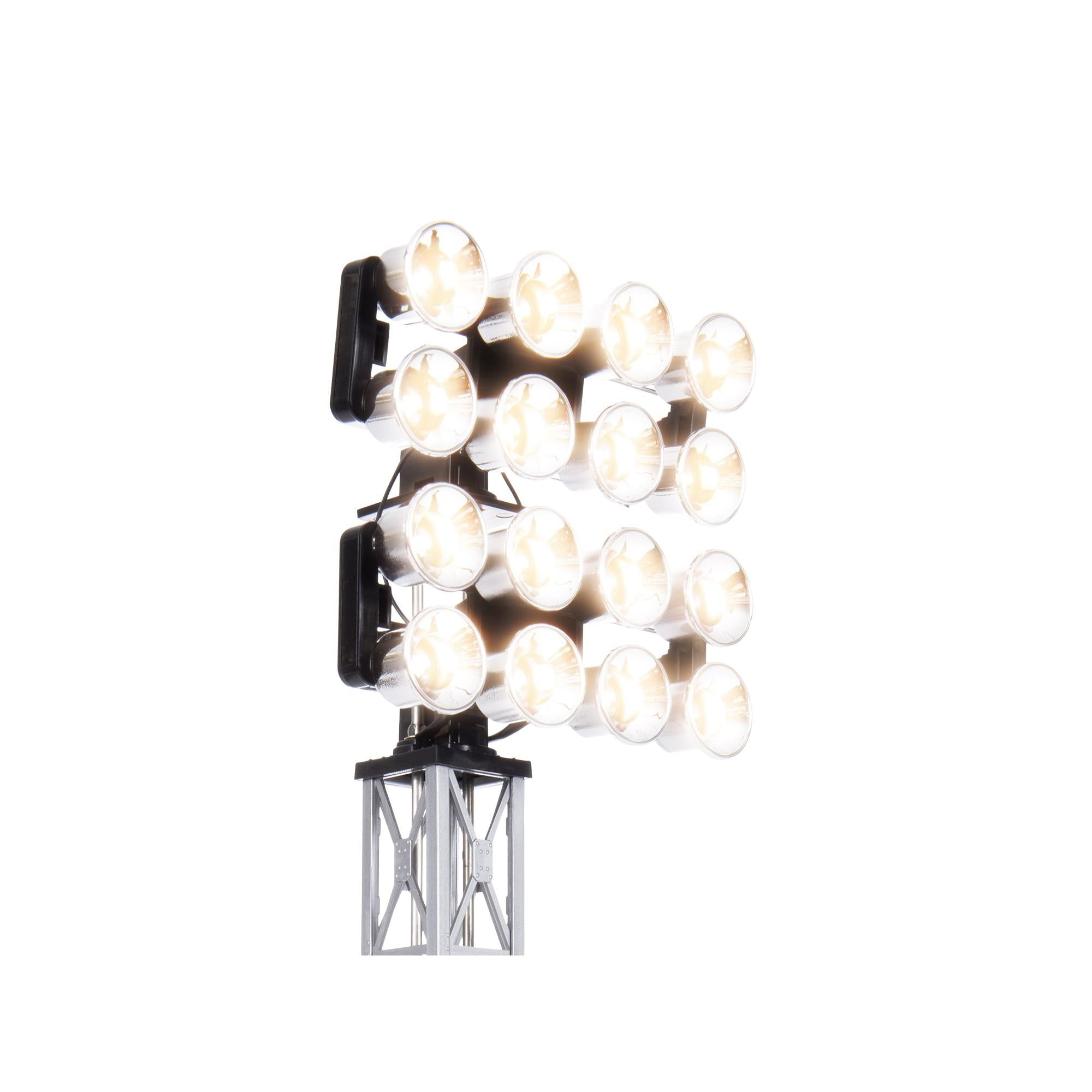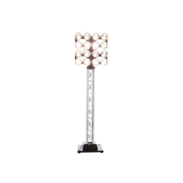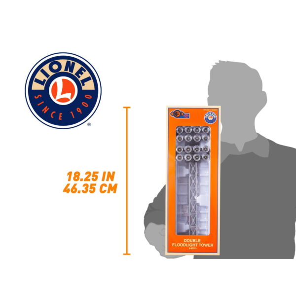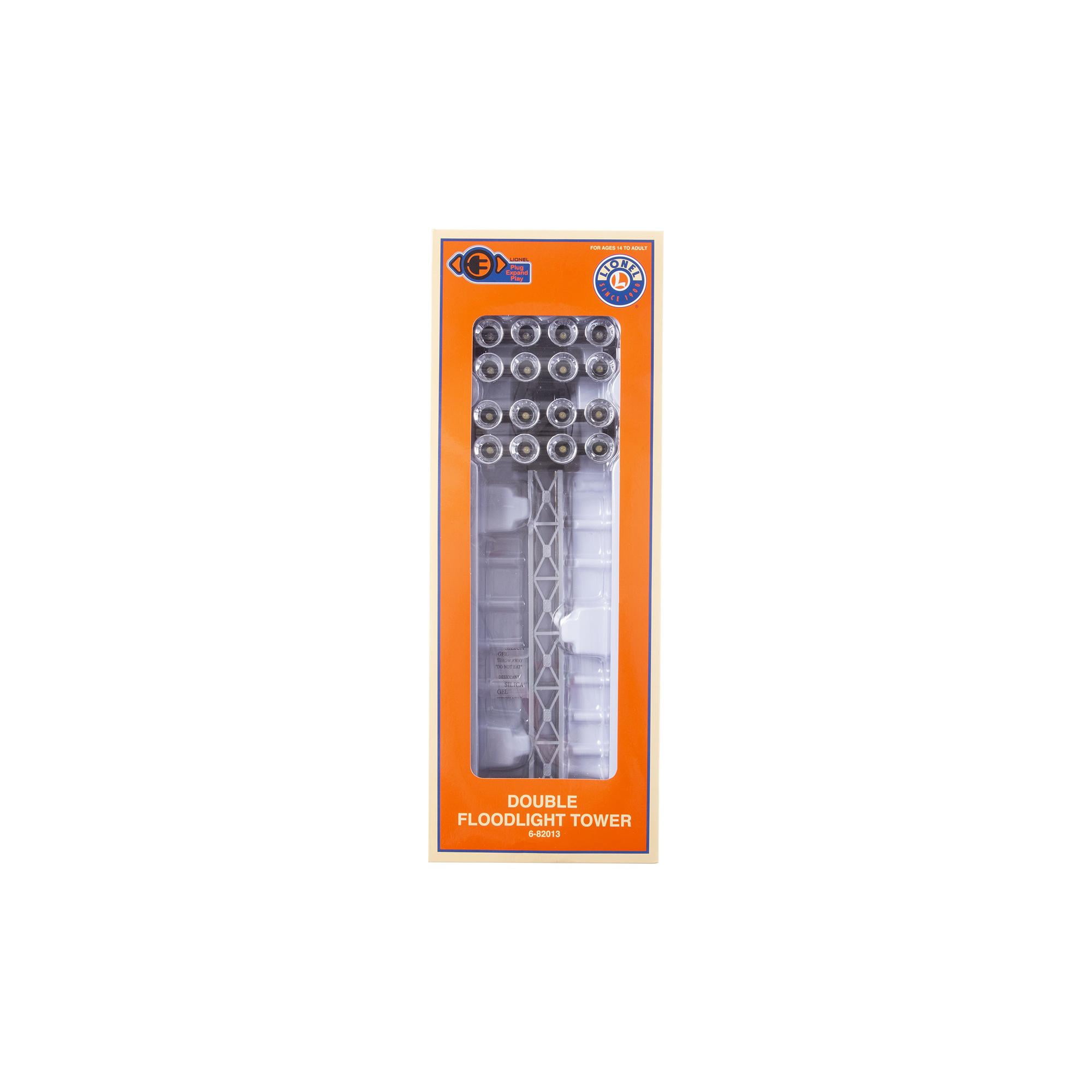 Lionel Plug Expand Play O Gauge Double Floodlight Tower Model Train Operating Accessory is sure to light up any train layout. Floodlight Tower features sixteen light LED illuminations, has two independent tilting heads and screw mount holes on base to secure accessory to layout. Position your Plug-Expand-Play accessory on your layout, Plug accessory into a FasTrack Plug-Expand-Play Lock-on and plug in your power supply to operate.