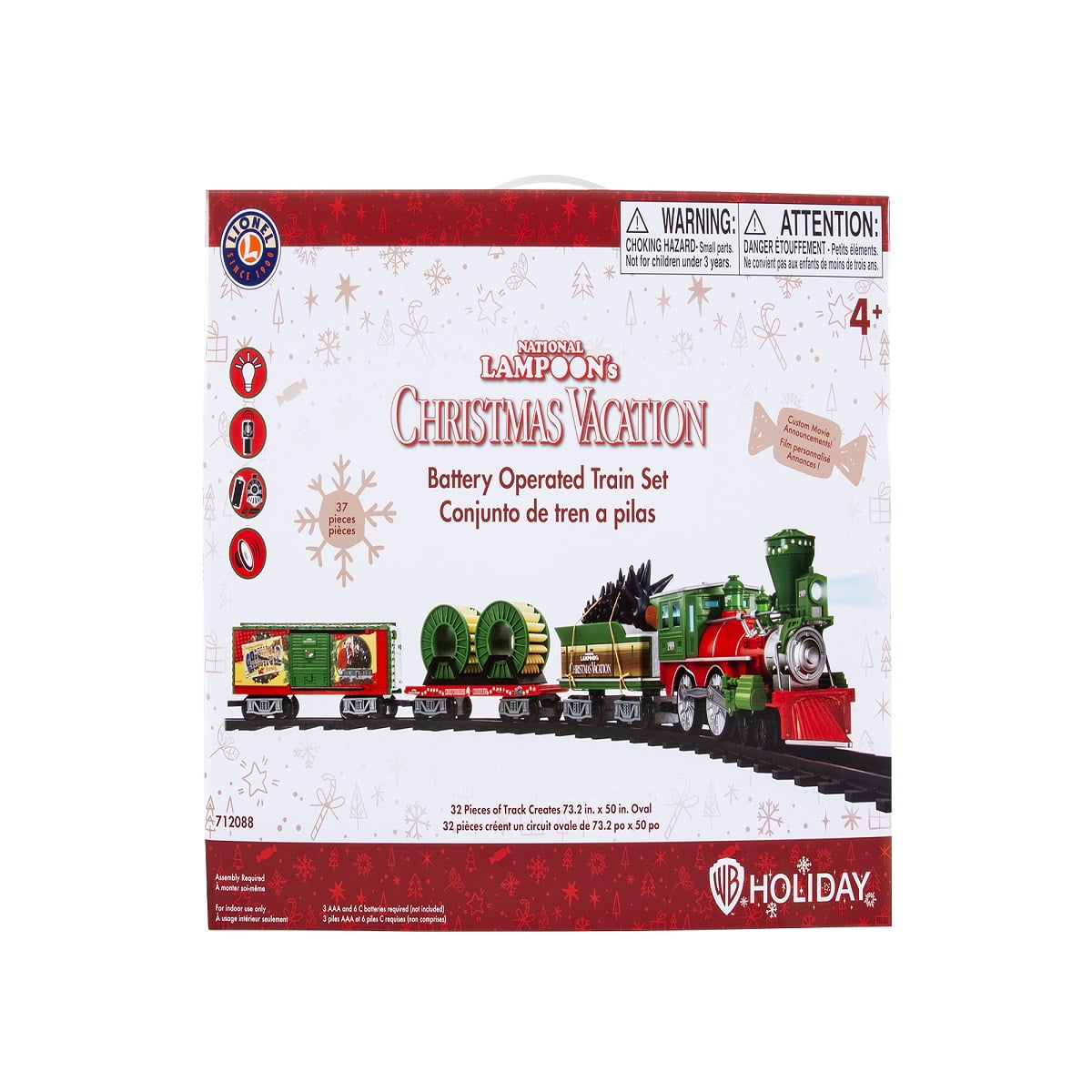 Climb aboard for a very merry Griswold Christmas! Clark Griswold is determined to make this holiday great, and he’s loaded up this Lionel Warner Bros. Christmas Vacation train set with everything he needs to deck the halls! This set features a general style locomotive, tender with Christmas tree load, flatcar with removable Christmas-light reels, and boxcar with special movie deco. This set is perfect for under the tree or a fun collectible for all the National Lampoon’s Christmas Vacation fanatics! Features: SET INCLUDES: 39 Piece Set 1 General style locomotive (requires 6 C batteries – not included) 1 Tender with tree load 1 Flatcar with 2 removable Christmas-light reels 1 boxcar with movie specific deco 24 curved track pieces 8 straight track pieces Remote control (requires 3 AAA batteries – not included) Authentic train sounds and announcements! Engine has working headlight! Product Specifications: Gauge: Ready-to-Play