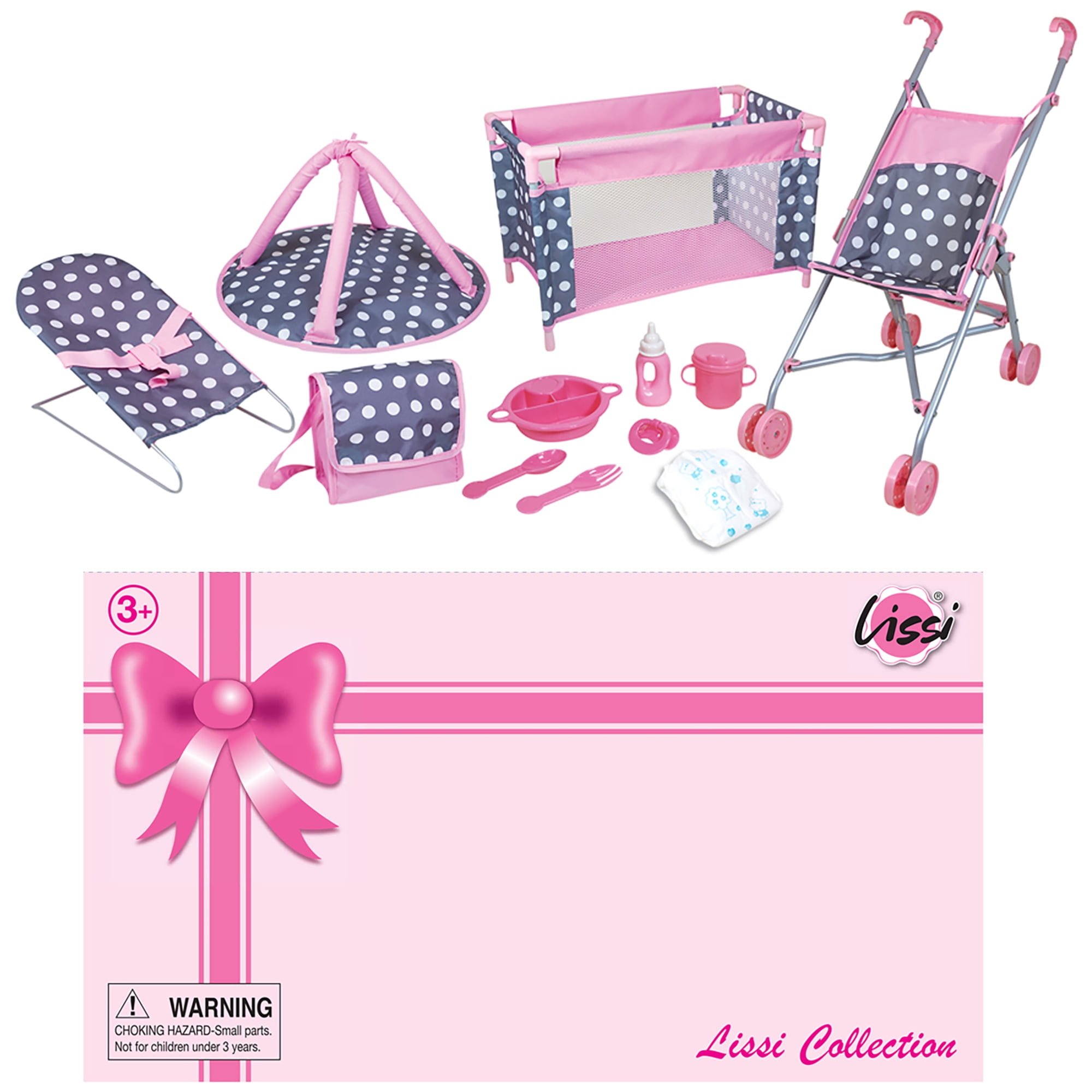 Lissi Deluxe Nursery Play Set, 5 Piece Doll Playset with 8 Accessories, Fits 16″ Dolls Includes 8 accessories for a complete play experience Features an umbrella stroller for easy transport Comes with a travel bed for on-the-go naps Play gym encourages interactive playtime Bouncer provides a cozy spot for baby dolls Includes a bag and diaper for realistic nurturing Designed for baby dolls up to 16 inches tall Perfect for imaginative play and nurturing skills