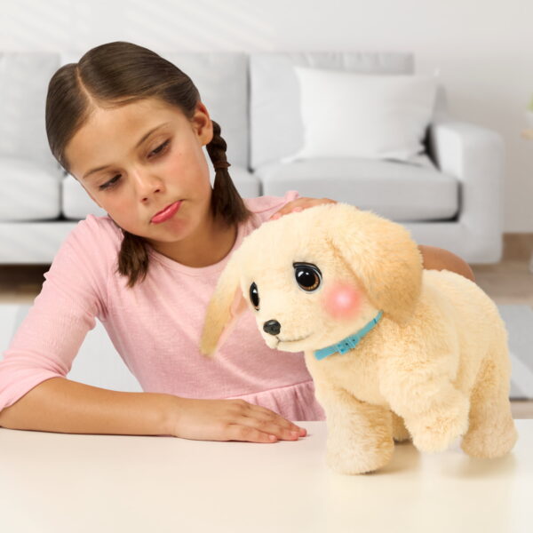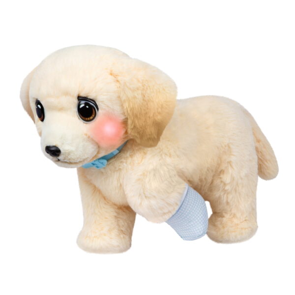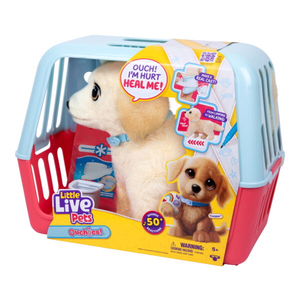 Little Live Pets Ouchies! Cooper is an adorable retriever puppy that needs your help to heal his injured paw so he can walk & be happy again! Nurture your injured puppy with a cast, bandages, and lots of love. Ouchies is super interactive with 50+ sounds and reactions – he walks, reacts to your touch, has glowing cheeks, and makes super adorable sounds! When you meet Cooper, he is a sad limping puppy with rosy glowing cheeks to let you know he isn’t feeling well. Put on the splint, wet the bandages, and wrap them around the splint to create a cast just like a real vet. Once it dries, you can even decorate the cast! Give Cooper lots of love and care so that he can feel better! When Cooper is ready he’ll play a happy sound, letting you know it’s time to remove his cast. Watch as Cooper transforms from injured to healed. His head will lift up, and he will be able to rest his paw and walk to his happy song! Ouchies comes with a puppy carrier that also transforms into a vet tray and 15 pieces! Experience interactive vet play and transformation by truly helping and healing your walking Ouchies puppy!