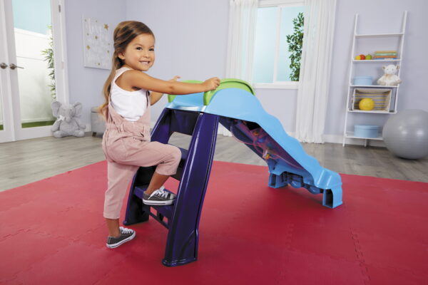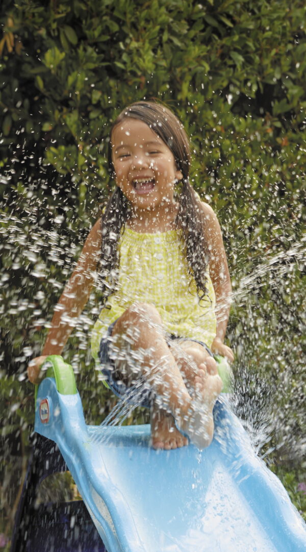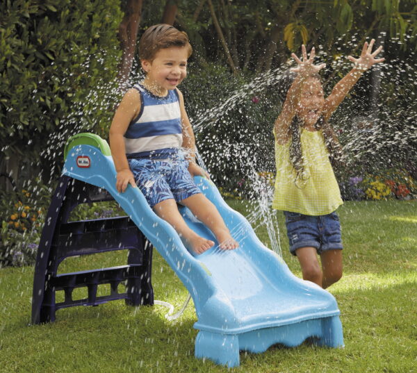 TODDLER’S FIRST SLIDE – Beginner slide, perfect for toddlers to learn on SPRAY AND PLAY – Connect the hose to get water spraying thorough the jets above the slide when kids go down ALL WEATHER ACTION – Ready for sliding indoors or outside 2-IN-1 SLIDING FUN – Can be used as a regular slide when hose is not turned on EASY STORAGE – Slide folds up for easy, compact storage