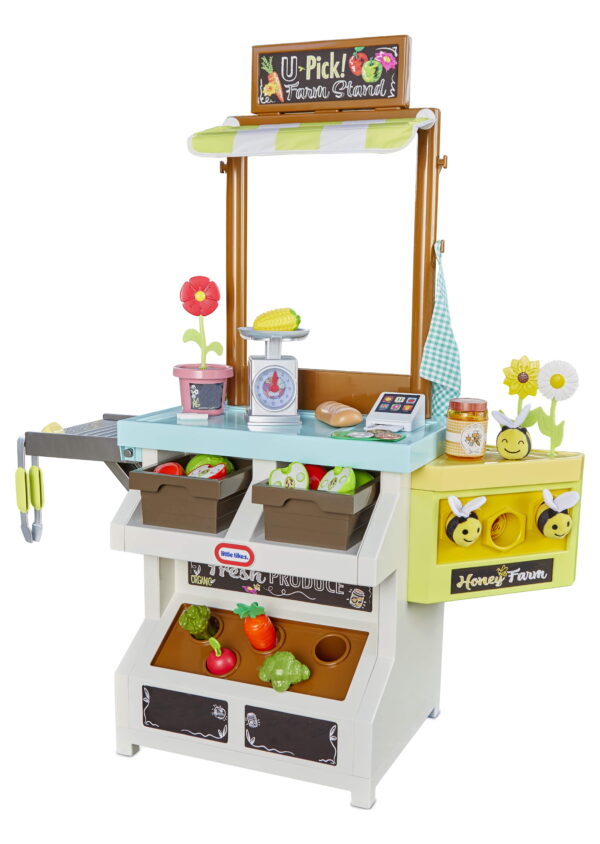 REALISTIC: Inspired by the stands at a Farmers Market along with a side grill and realistic accessories. SO MANY WAYS TO PLAY: Kids can grow their own fruits and veggies, sell them and then cook the pretend food. MULTI-KID PLAY: Multiple kids can play at once and take turns growing, cooking, selling and buying all the wonderful, natural creations. ENCOURAGES IMAGINATION: With over 30 included and role play accessories kids can help the bees pollinate and make honey, grow fruits and veggies, weigh and sell the produce with the credit card reader, and then cook up an incredible pretend meal on the side grill. SPECIAL ADDITIONAL FEATURES: Interactive flower garden where kids can plant and pick flowers and customize the pot. And everything you need to grill and serve. PLENTY OF STORAGE: Kids can easily store all the accessories in the bins during and after playtime. PRODUCT INCLUDES: Over 30 role play accessories like fruits, veggies, bees, flowers and pot, scale, credit card reader, chalk and more. Age: 2+ Years
