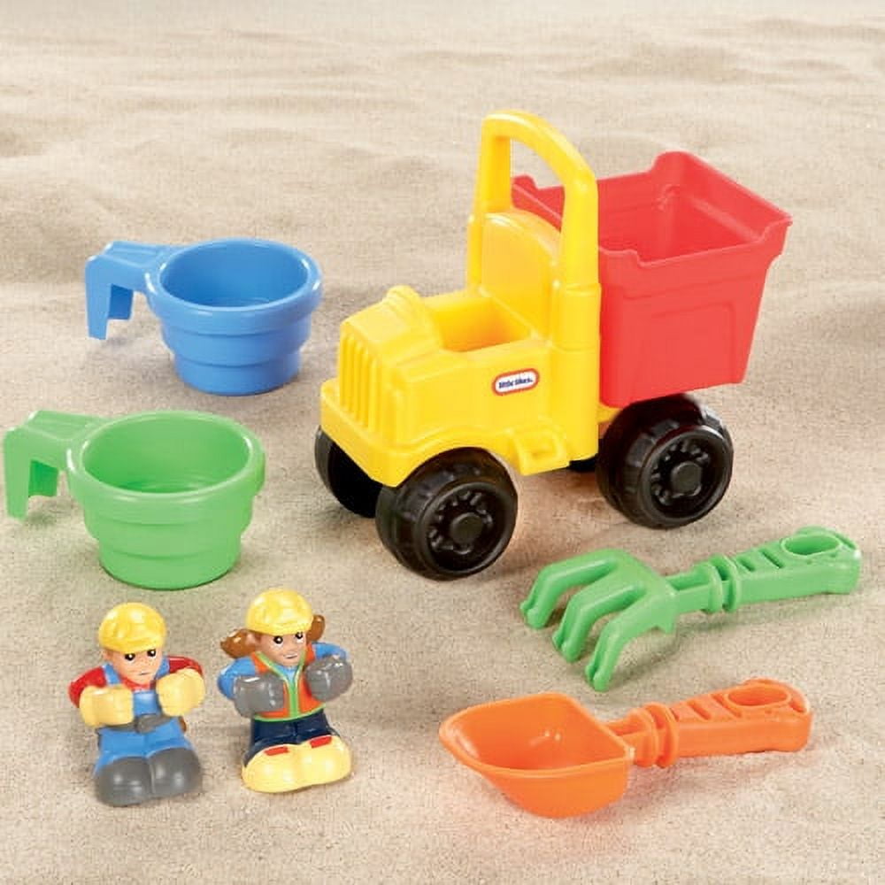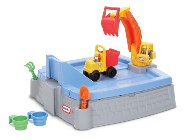 Age range: 3 years and up 2 characters Sand cup Sand sifter Shovel Rake Dump truck 2 characters Sand cup Sand sifter Shovel Rake Dump truck Sand area features molded-in ramps and roadways Working excavator digs in the sand and helps you load your dump truck Truck ramp doubles as a lid to keep the sand dry and clean Assembly required before using the Little Tikes digger sandbox