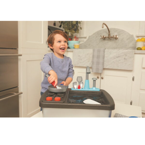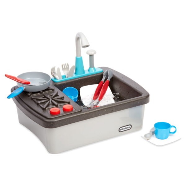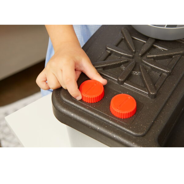 Kids can pretend to cook and wash dishes just like their parents with the realistic Little Tikes First Sink & Stove. This sleek, modern pretend play combo sink and stove is packed with features: a working water pump, clicking knobs, and more. Plus, it makes realistic sounds when kids turn the knobs on the stovetop burners. Pretending to cook, wash dishes, and do other chores helps kids gain a sense of responsibility, an important part of social-emotional learning. The First Sink & Stove fits all 13 included accessories for easy cleanup too. Encourage kids to engage in imaginative pretend play with the First Sink & Stove by Little Tikes!