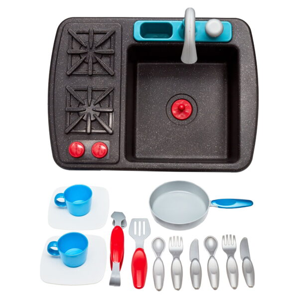 Toy sink & stove designed for kids to pretend they’re cooking & washing dishes using the real thing for hours of pretend play fun Pretending to wash the dishes & do other chores helps kids gain a sense of responsibility Pushing down on the built-in water pump releases the water from the faucet Turning the knobs on the stove burners makes realistic clicking sounds Kids can use the sink basin to store the included accessories Includes 13 kitchen accessories: 2 mugs, 2 plates, 2 knives, 2 forks, 2 spoons, a frying pan, a spatula, and tongs No batteries required Ages: 3+ Years