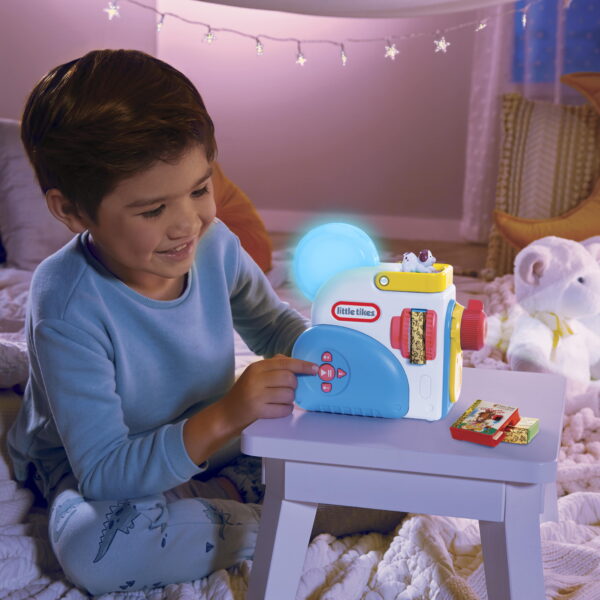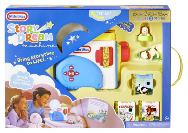 Storytime comes to life with the easy-to-use Little Tikes Story Dream Machine. Children can watch, listen, and read along to their favorite stories. This unique, fun experience develops beginning reading skills and word recognition and will get kids excited about reading. Includes 3 Little Golden Book stories: The Poky Little Puppy, Tawny Scrawny Lion, and The Saggy Baggy Elephant and The Poky Little Puppy character that creates more light effects in nightlight mode. Colorful lights and sound effects help each story magically unfold. The recommended projection distance is 2 to 6 feet.