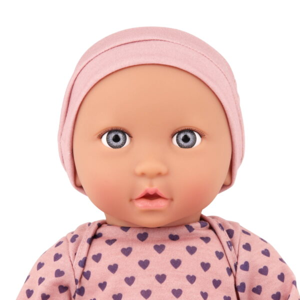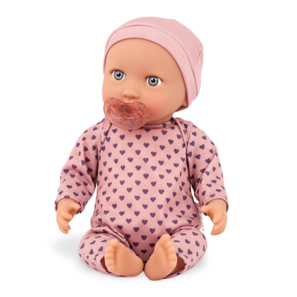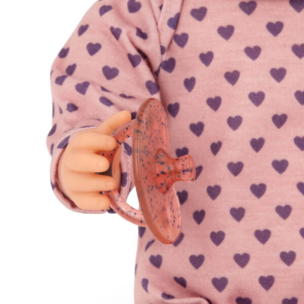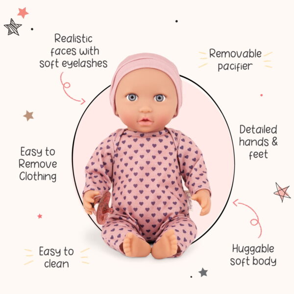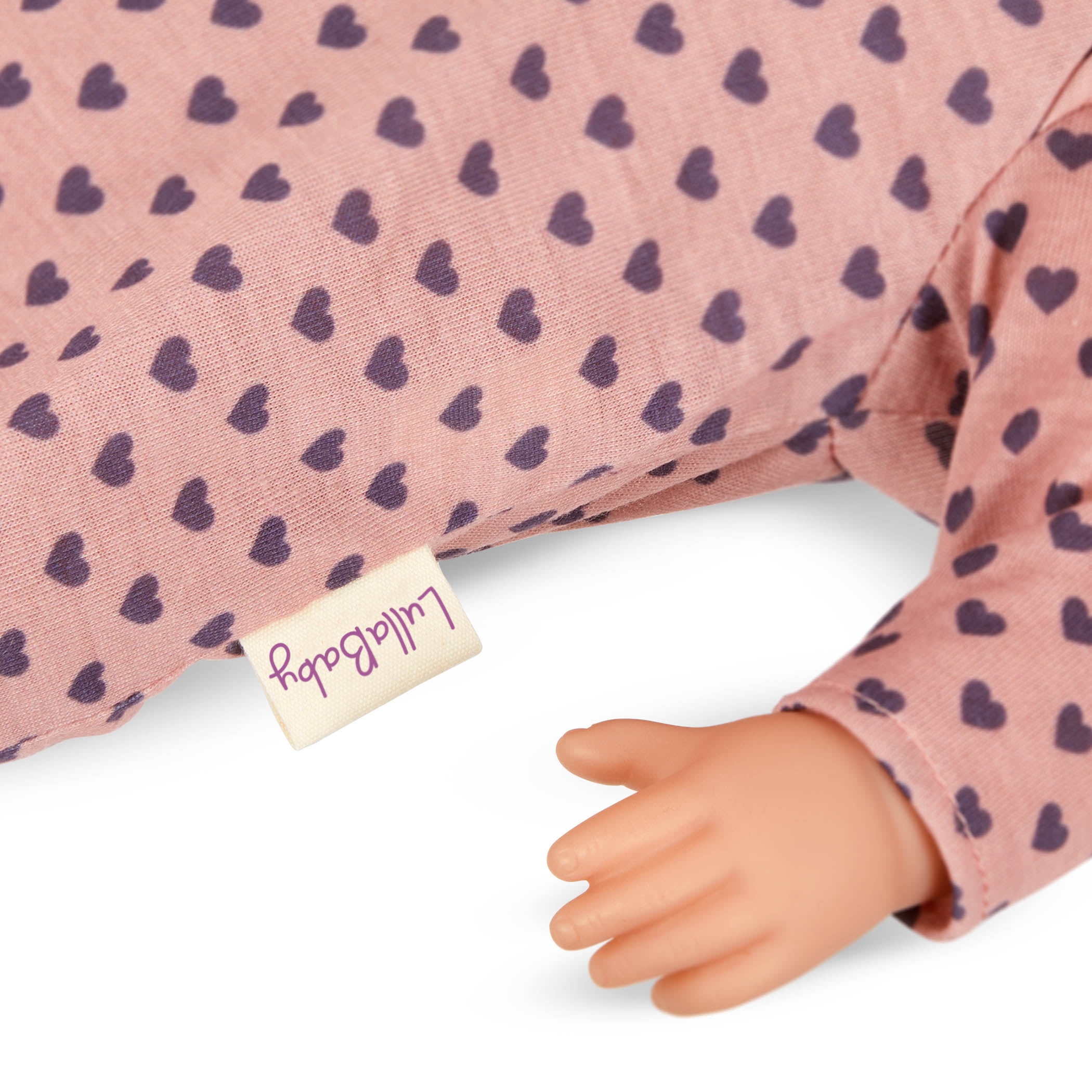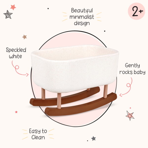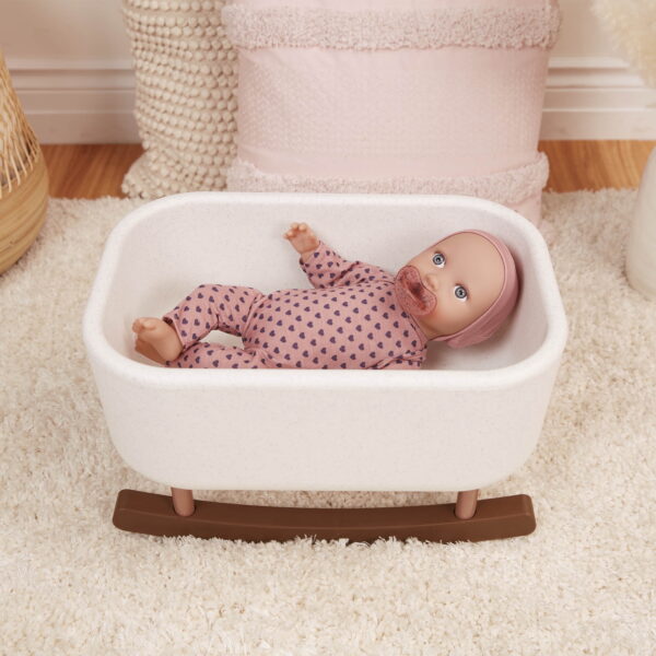 The LullaBaby doll & bassinet set invites children to explore nurturing play with a modern, speckled white bassinet and a 14″ baby doll. The realistic doll features unique gray eyes, soft eyelashes, detailed hands and feet, and a huggable soft body. Young caregivers can easily remove the polka-heart pajama and hat, and soothe their baby with the included pacifier. The durable, easy-to-clean bassinet is perfect for creating a cozy nursery corner and rocking baby to sleep. Compatible with most 14″ baby dolls and accessories. Safety tested to meet all BPA and phthalate requirements. Great gift for kids ages 2 and up.