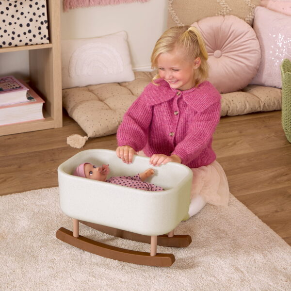 Kids can take loving care of their baby doll and rock them to sleep with the adorable LullaBaby bassinet The 14-inch baby doll has soft eyelashes and unique gray eyes set in a realistic face with a cuddly soft body perfect for little hugs Includes a baby doll, pacifier, pajama outfit, and a rocking bassinet Inspires hours of pretend play while encouraging empathy and nurturing imagination Rocking bassinet comes fully assembled and fits most 14-inch baby dolls comfortably Recommended for kids ages 2 and up