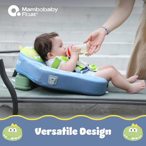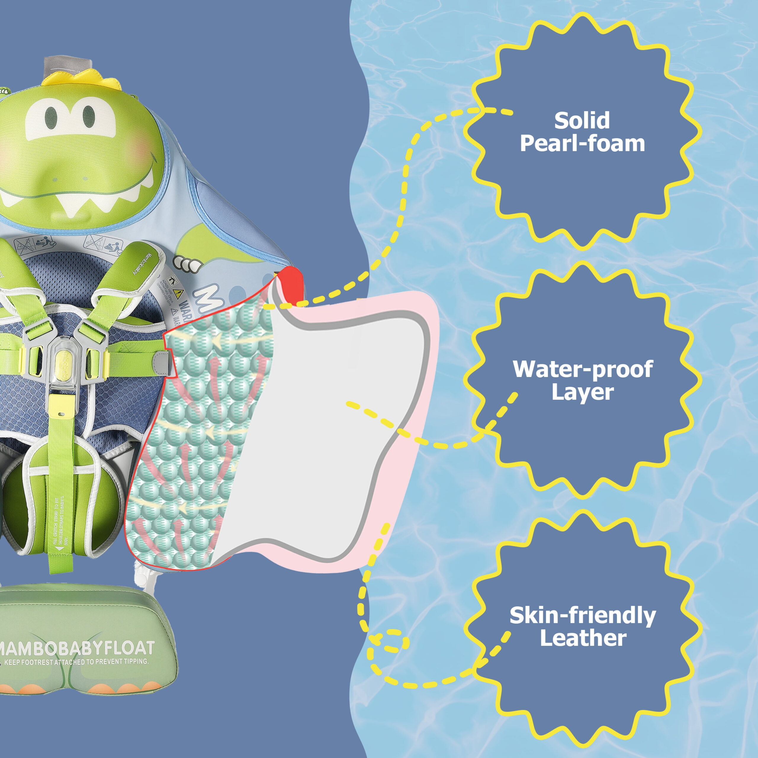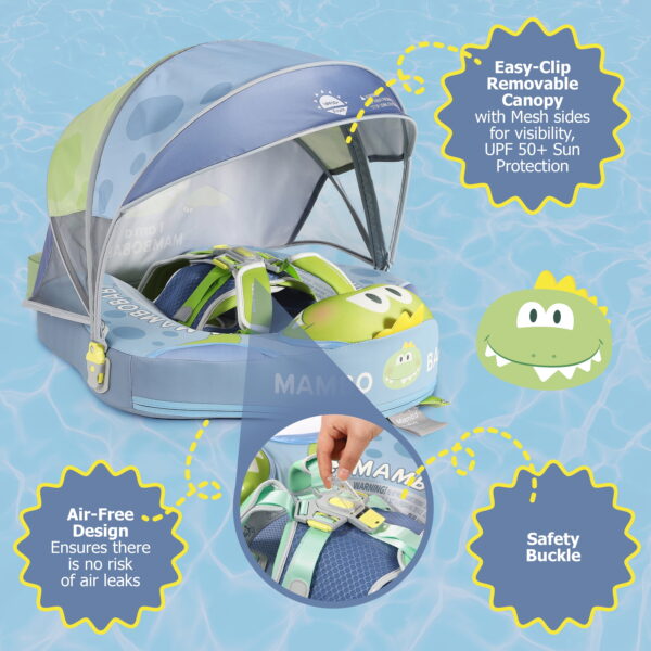 Introducing the Mambobaby Sunny Navigator Baby Float with Canopy a perfect blend of safety, comfort, and fun. Specially designed for little ones, this baby swimming float provides a secure and enjoyable water experience with upgraded safety features for peace of mind for parents. Equipped with a five-way buckle system and a 40 angle for optimal balance, the Mambo Baby Float offers exceptional stability to allow your baby to float comfortably. The floats foam inner liner technology eliminates the air leakage risk of inflatables, making it safer and more reliable than traditional inflatable pool float products. Protect your babys sensitive skin with the infant floatie made from soft and skin-friendly materials plus a removable footrest and removable UPF 50+ sun canopy that provides extra protection from direct sunlight. Please note that this product does not completely protect against drowning. Only use under constant supervision of an adult and always keep your baby within arms reach.