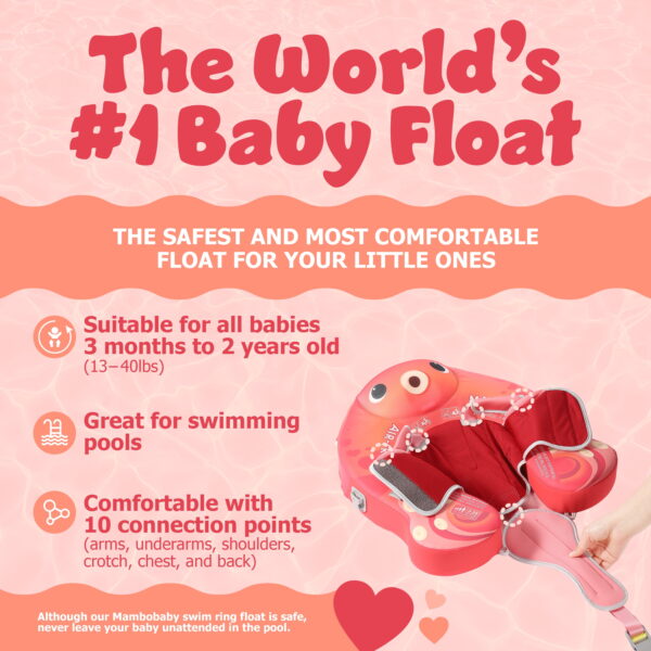 Mambobaby Float offers innovative solutions for safe and enjoyable water experiences with infants and toddlers. Mambobaby floats are rated by millions of families and thousands of baby spas throughout Europe and the United States. Featuring an upgraded safety with a 5-point buckle system and 40 angle for optimal balance, this float offers a secure and enjoyable experience. With an adjustable, comfortable fit and an adorable design, the Mambobaby Lite ensures fun in the water while prioritizing safety. THIS IS NOT A LIFESAVING DEVICE. DO NOT LEAVE CHILD UNATTENDEDWHILE DEVICE IS IN USE. CHILD MUST FACE TOWARDS YOU UNTIL HE OR SHECAN HOLD HIS OR HER HEAD UPRIGHT.