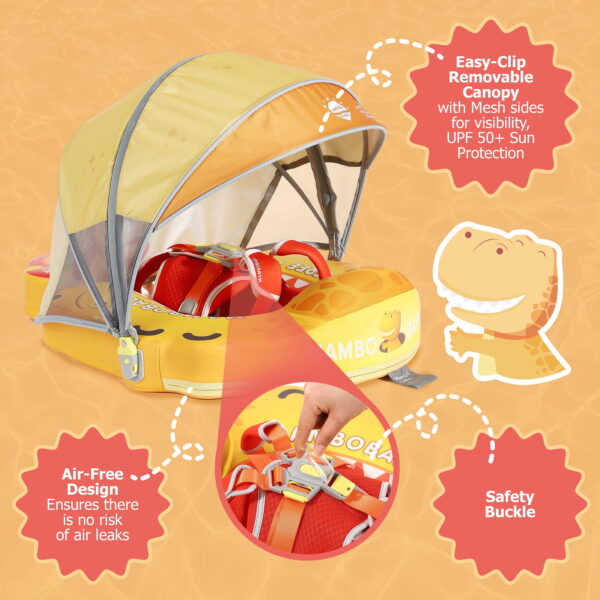 Introducing the Mambobaby Sunny Navigator Baby Float with Canopy a perfect blend of safety, comfort, and fun. Specially designed for little ones, this baby swimming float provides a secure and enjoyable water experience with upgraded safety features for peace of mind for parents. Equipped with a five-way buckle system and a 40 angle for optimal balance, the Mambo Baby Float offers exceptional stability to allow your baby to float comfortably. The floats foam inner liner technology eliminates the air leakage risk of inflatables, making it safer and more reliable than traditional inflatable pool float products. Protect your babys sensitive skin with the UPF 50+ sun canopy that provides extra protection from direct sunlight. Only use under constant supervision of an adult and always keep your baby within arms reach.