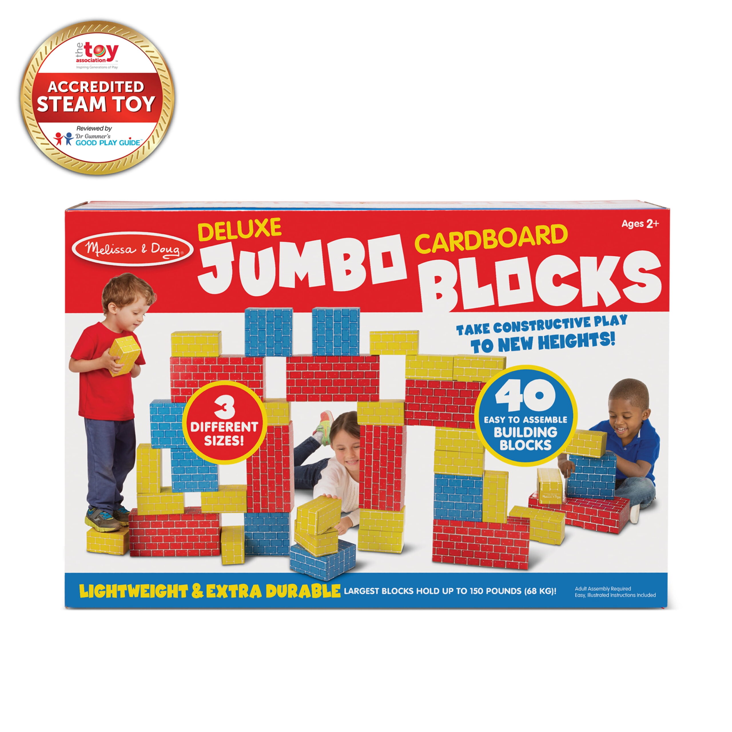 Includes 40 blocks in 3 different sizes (12″ x 6″ x 3″; 6″ x 6″ x 3″; 6″ x 3″ x3″) to inspire creative building and play Made of premium, extra-thick cardboard – red blocks hold up to 150 pounds Bright, colorful graphics on every block; lightweight and easy for children to lift Includes step-by-step instructions for easy fold-together assembly (adult assembly required) Makes a great gift for toddlers and preschoolers, ages 2 to 5, for hands-on, screen-free play; product made with FSC-certified materials that support responsible forestry; applies to new inventory only (FSC C156584)