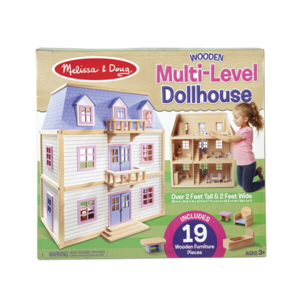 Sturdy, spacious, and versatile wooden three-level, five room dollhouse with 19 pieces of wooden doll furniture, perfect for growing kids Detailed illustrated instructions make assembly fast and easy Features two movable staircases for different looks, five working exterior doors, and 19 pieces of hand-painted solid wood doll furniture with working doors and drawers 28 x 24.5 x 15.5 assembled; this product ships in its own special e-commerce packaging intended to be easier to open and reduce waste (curbside recyclable) Makes a great gift for 3- to 10-year-olds, for hands-on, screen-free play
