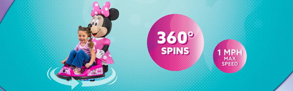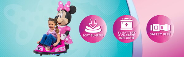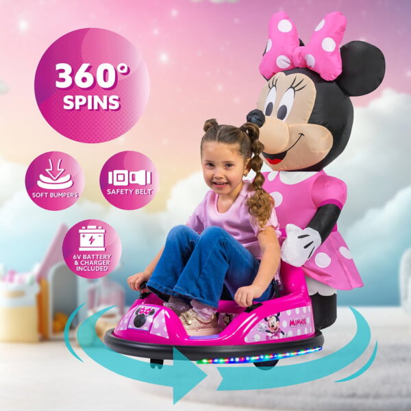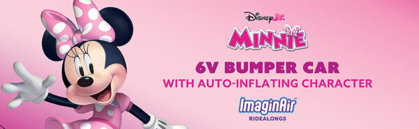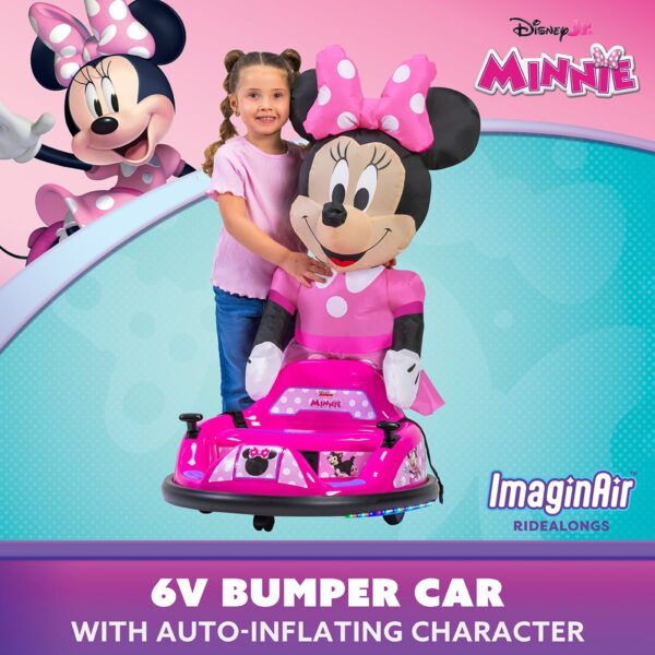 Minnie Mouse 6V ImaginAir Ride On Bumper Car with Inflatable Character Inflatable Character: Minnie Mouse Inflatable instantly grows to 3 feet – just turn it on and go Safety: Features an adjustable seat belt, 1.5 MPH max speed, and soft rubber bumper to protect walls and furniture 360-Degree Spins: Dual joystick controls allow for easy steering and full 360-degree turns, ensuring endless giggles and smiles Flashing LED Lights: Comes with exciting flashing LED lights that glow bright, enhancing the fun experience Easy Assembly: Vehicle comes fully assembled; simply attach the bumper, charge the battery, and it’s ready to go Rechargeable: Includes a 6V rechargeable battery and 120V wall charger for continuous playtime Character Storage & Dual Play: Ride with or without the inflatable character for double the fun, and when playtime is over, simply deflate and store the character in the back of the car