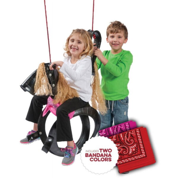 A re-inspired classic sure to capture children’s imagination. The Pony Pal Tire Swing is a recycled, repurposed tire made into the cutest pony in the field. Tan mane and tail keep this pony neutral while the included pink and red bandana let your rider customize their pony as they wish. Trademarked PVC stabilizer bar and recessed seat make it easy for riders to safely saddle up and swing, twist, and spin. Just like a real pony, this swing can withstand the elements. The durability of a tire combined with a UV resistant rope and the creative detail and design of the always favorite pony means this swing will be around the stable for years.