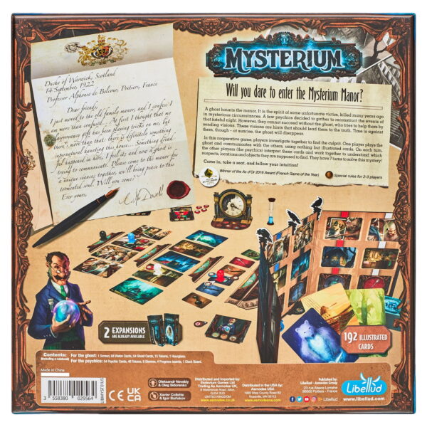 Mysterium is a cooperative, deduction game that challenges two to seven players to solve a murder that occurred thirty years ago. Players work together to solve a mystery by psychically communicating with the victim. Dozens of different suspects, weapons, and locations ensure no two games are the same! Each player must investigate a case assigned to them, determining if this was, in fact, the actual murderer. Mysterium is a great cooperative choice for game night with friends and family.