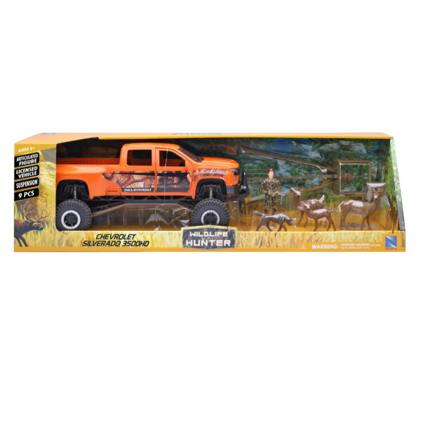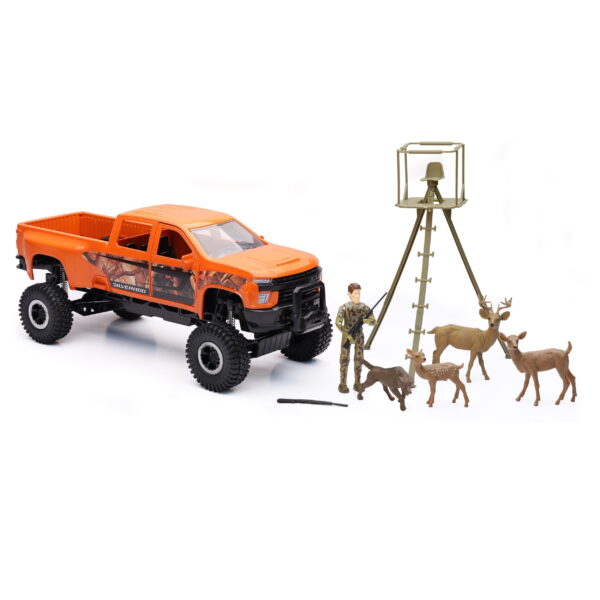 This set is for those future hunters. The New Ray Wildlife Hunter set #SS-76806 features a 1:18 Scale Chevrolet Silverado 3500HD Free Wheeling Truck. Orange in color with Camo details on the side and Doors that open. It’s a 9 Pc. Set with an articulated figure, Animals and Accessory Pieces. This set is the perfect Birthday or Holiday Gift for any Child ages 5 Years and Up. A Great Role play toy that encourages imagination and creativity.