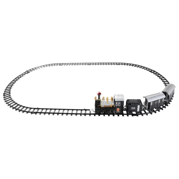 Watch this delightful 14-piece train set bring endless joy this holiday season Track can be configured in either a round or an oval shape Recommended for ages 5+ Product features: Makes realistic train sounds Locomotive features a working head light 10 pieces of track for a total of over 10 feet Includes 6 curved and 4 straight track pieces Convenient on/off switch Requires 2 “AA” size batteries (not included) Some easy assembly required Dimensions of train cars: Locomotive: 3.75″H x 8″L x 2″W Coal tender: 2.5″H x 5″L x 2.25″W Passenger car: 3″H x 6.5″L x 2″W Caboose: 3″H x 6.5″L x 2″W Material(s): plastic